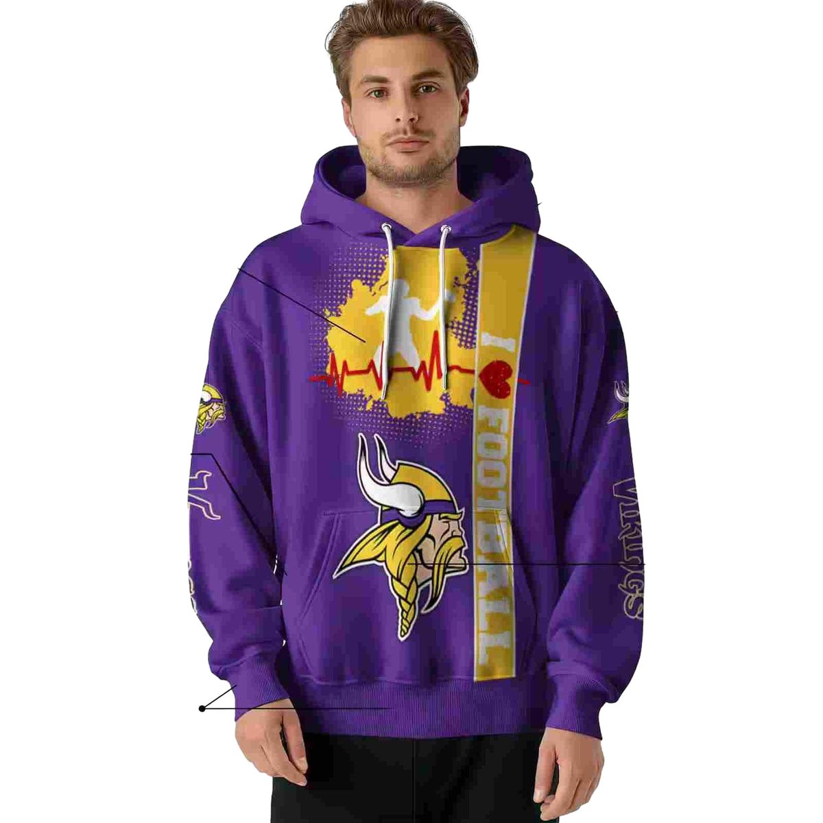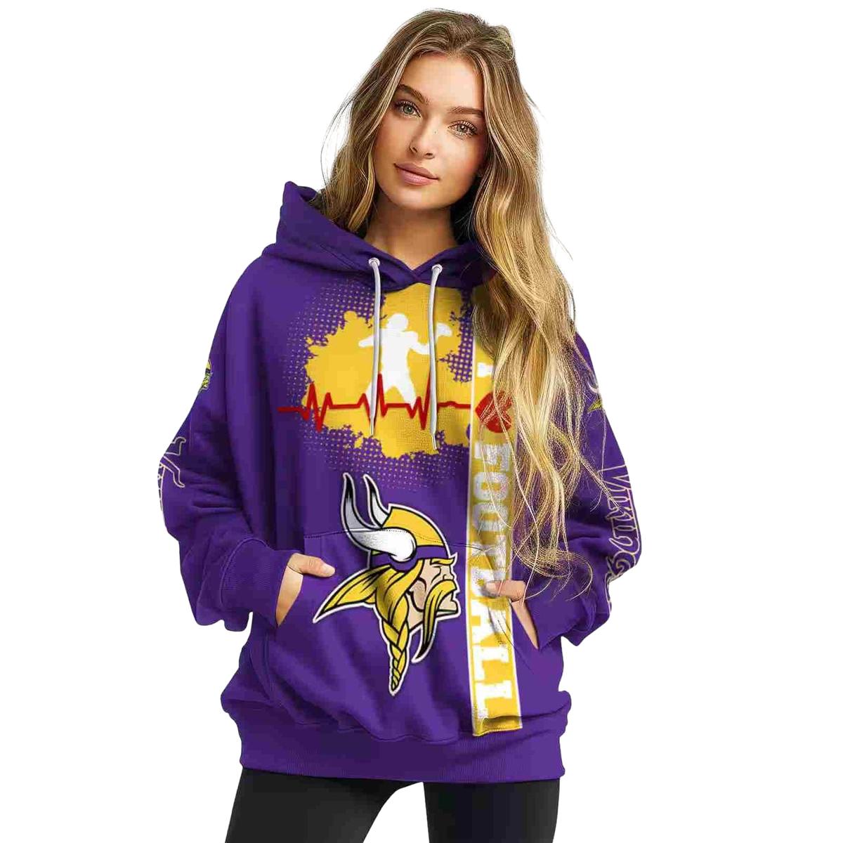 Show your unwavering support for the Minnesota Vikings with our Logo Heartbeat Purple All-Over Print Hoodie. Perfect for fans who enjoy casual outings or cozy days at home, this hoodie stands out with its unique design that combines team spirit and style. Whether you’re cheering from the stands or enjoying a winter walk, this hoodie is sure to keep you warm and fashionable.