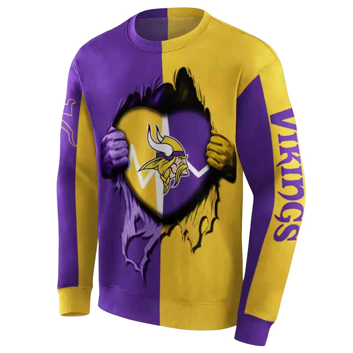 Show your unwavering support for the Minnesota Vikings with our Logo Inside Me Heartbeat Graphic Purple AOP Sweatshirt. Designed for die-hard fans, this stylish sweatshirt is perfect for game days, casual outings, or cozy evenings at home. Its all-over print combines vibrant team spirit with modern streetwear flair, making it a must-have addition to your wardrobe.