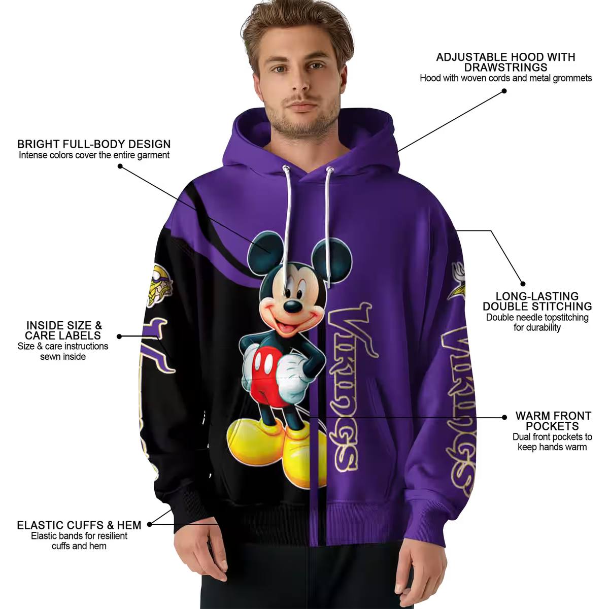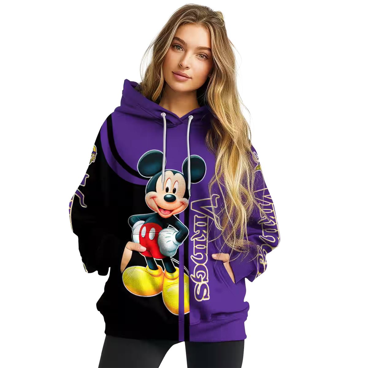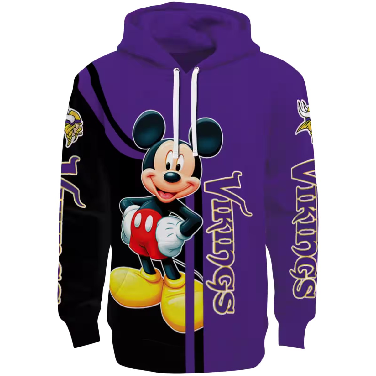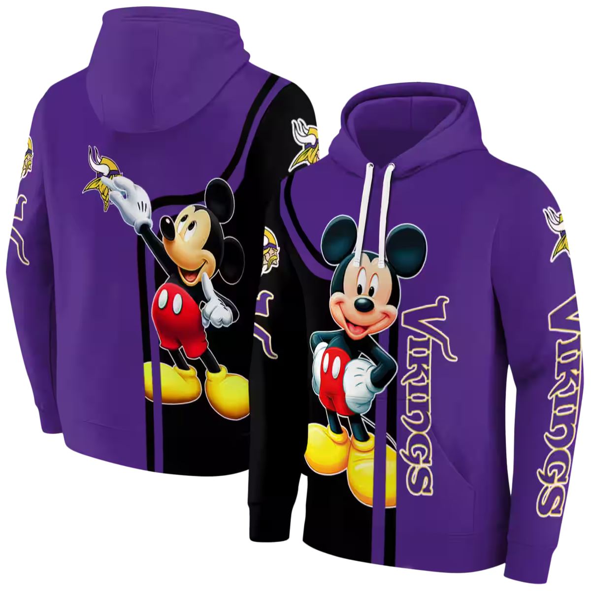 Embrace your love for the Minnesota Vikings and the whimsical charm of Mickey Mouse with our all-over printed hoodie. Perfect for fans looking to showcase their team spirit with a playful twist, this hoodie is ideal for casual outings, game days, or cozy nights in. Its unique design not only makes a bold statement but also ensures you stand out in comfort and style.