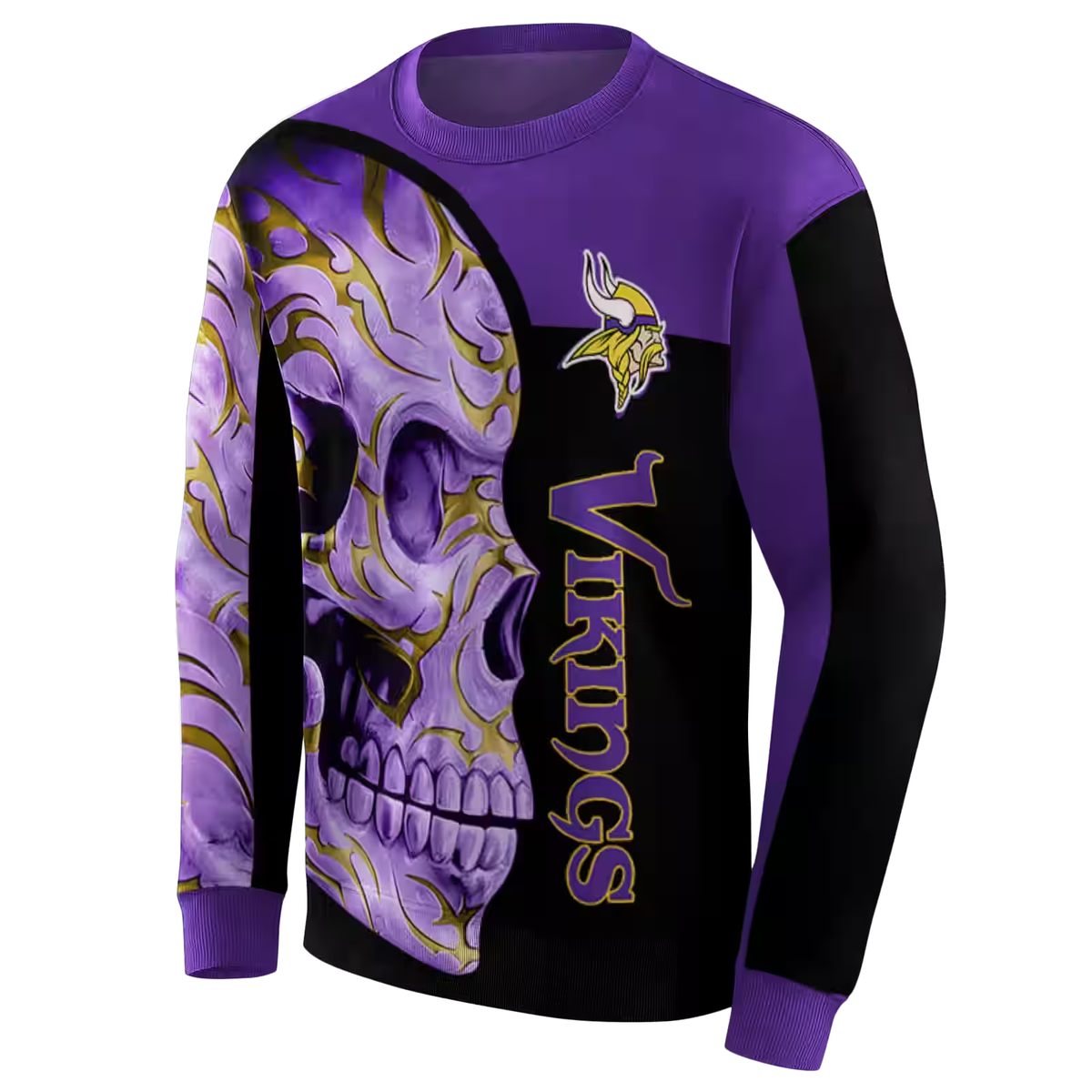Elevate your streetwear game with our Minnesota Vikings Skull Motif Purple Black AOP Sweatshirt. Perfect for dedicated fans and style-savvy individuals alike, this sweatshirt is ideal for casual outings, game days, or simply lounging at home. Its striking design not only showcases your team spirit but also adds a modern edge to your wardrobe.