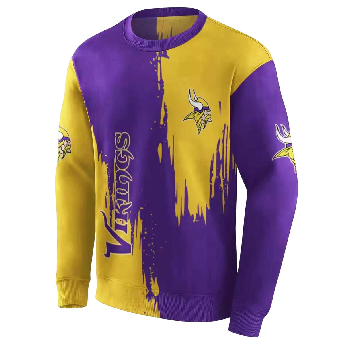 Elevate your streetwear game with our Minnesota Vikings Splatter Effect Yellow Purple AOP Sweatshirt. Designed for fans and fashion enthusiasts alike, this vibrant sweatshirt is perfect for casual outings, game days, or lounging at home. Its unique all-over print captures the spirit of the Vikings, making it a standout piece in your wardrobe.