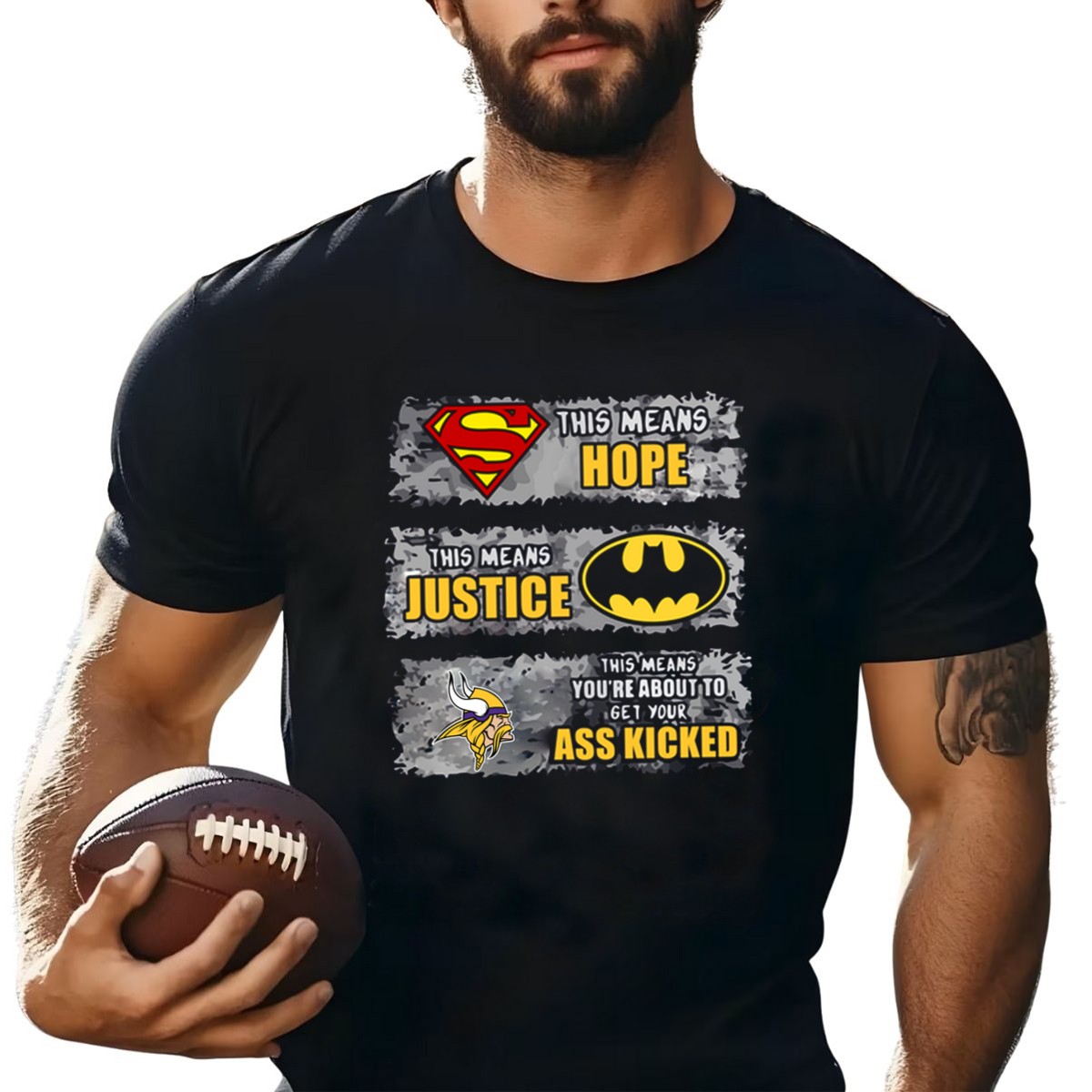 Show off your team spirit and fierce attitude with our Minnesota Vikings Superman Means Hope Batman Means Justice T-shirt! This unique fan-made design is perfect for die-hard Vikings supporters who want to make a statement at casual outings, themed events, or everyday wear. Crafted for comfort and durability, this shirt is sure to become a staple in your wardrobe, blending fun with fandom in a stylish way.