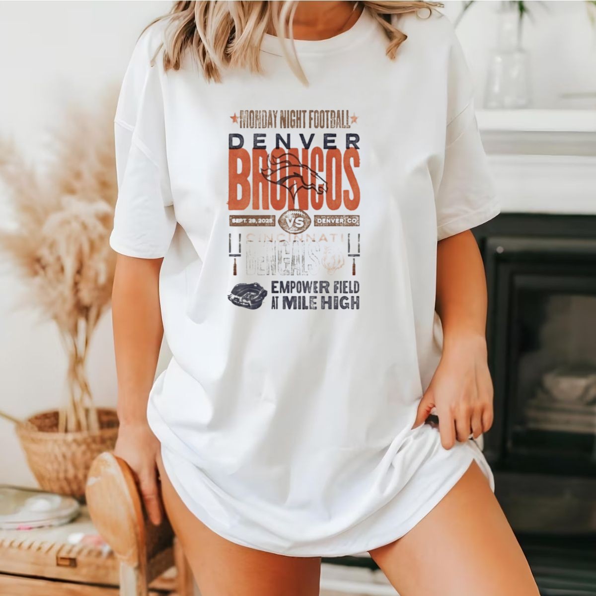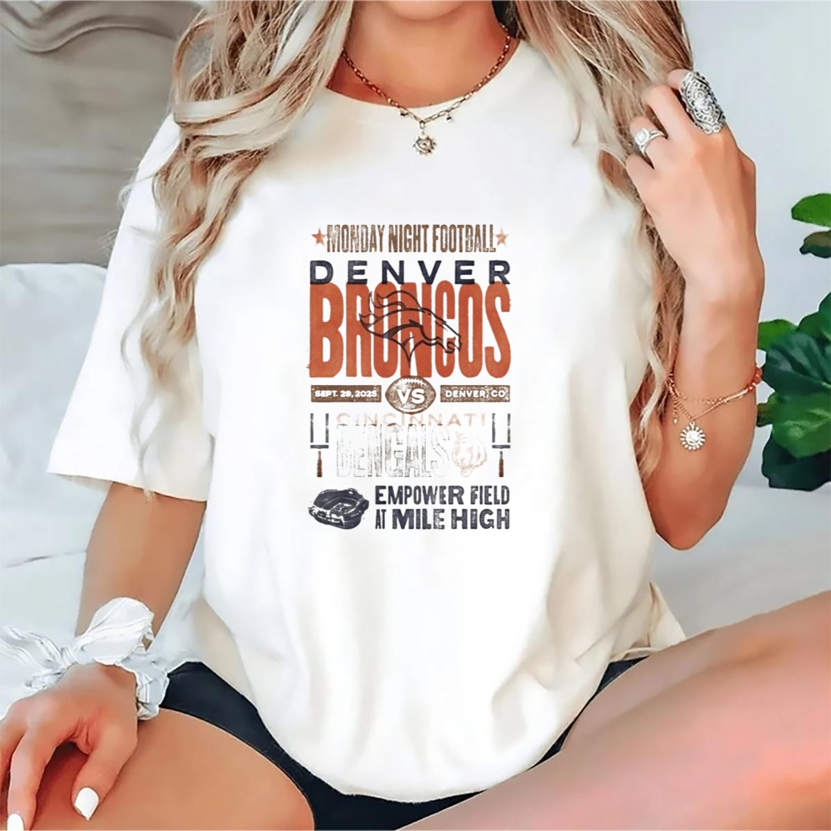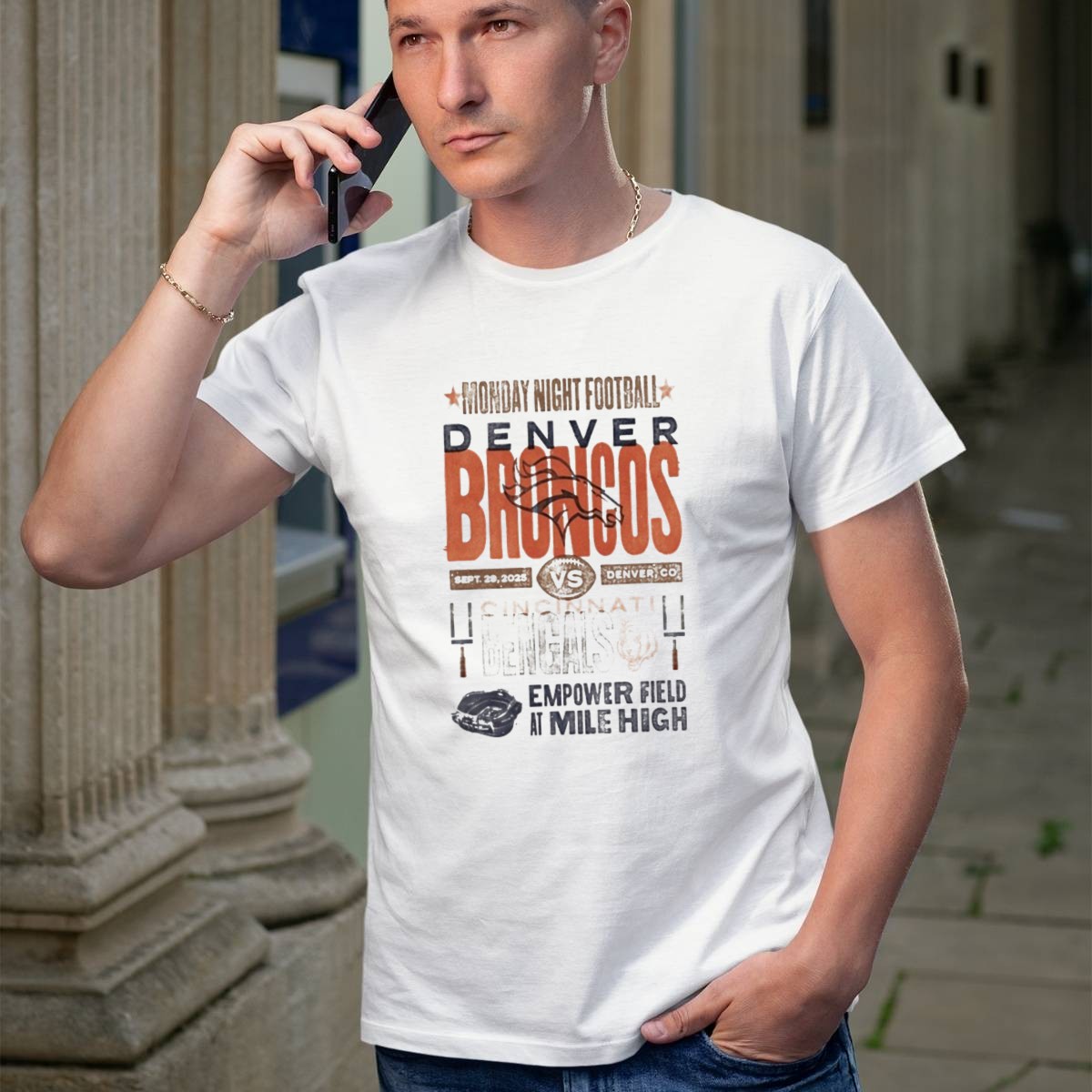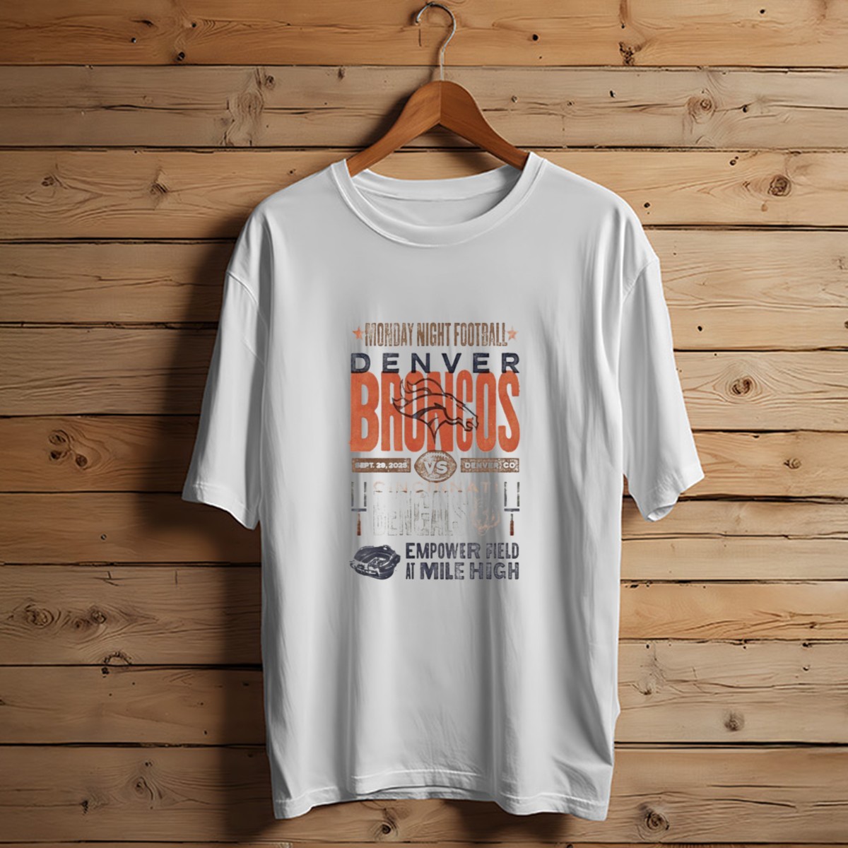 Get ready for game day with our Monday Night Football Denver Broncos vs Cincinnati Bengals T-shirt! Designed for passionate football fans, this shirt is perfect for wearing to the game at Empower Field at Mile High or while cheering from the comfort of your home. Featuring a unique fan-made design printed in the USA, this classic tee showcases your love for the sport and your favorite teams in a stylish and comfortable way.