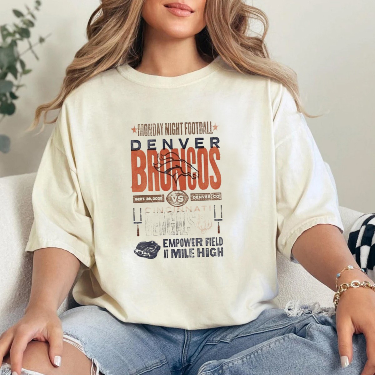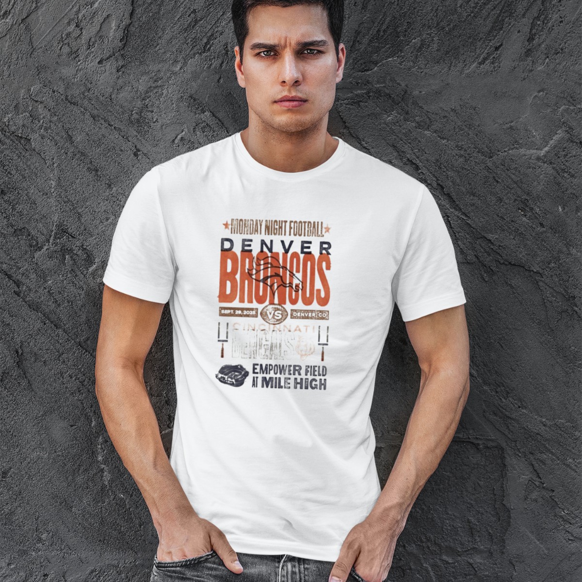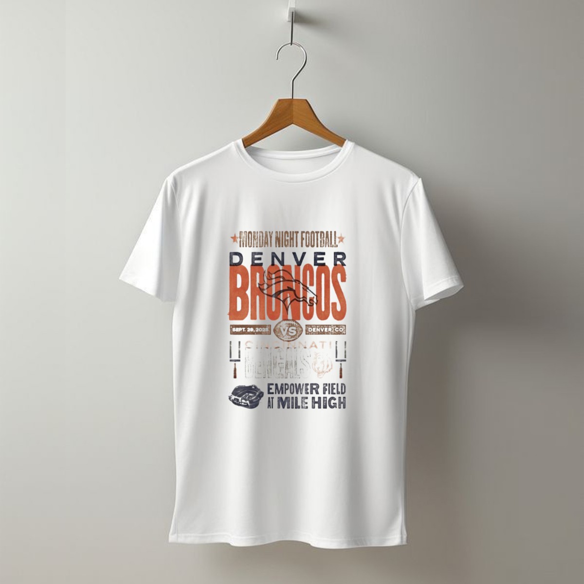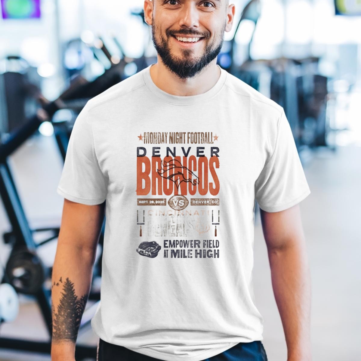Show your support for the Denver Broncos as they take on the Cincinnati Bengals in an epic showdown on September 29, 2025, at Empower Field at Mile High! This fan-made T-shirt captures the excitement of Monday Night Football, making it the perfect addition to your game day wardrobe or casual outings with friends. Crafted for comfort and style, it’s not just a shirt; it’s a celebration of your team spirit!