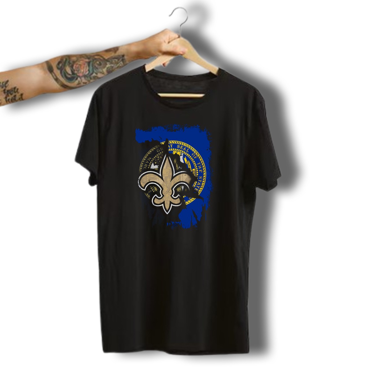 Show your pride for Nebraska with our exclusive Nebraska State Seal With Saints Fleur De Lis Emblem T-Shirt! Perfect for fans of the Cornhusker state, this shirt is ideal for casual outings, themed events, or daily wear. Its unique fan-made design, printed right here in the USA, showcases a blend of state pride and artistic flair, making it a must-have for anyone looking to express their love for Nebraska in style.