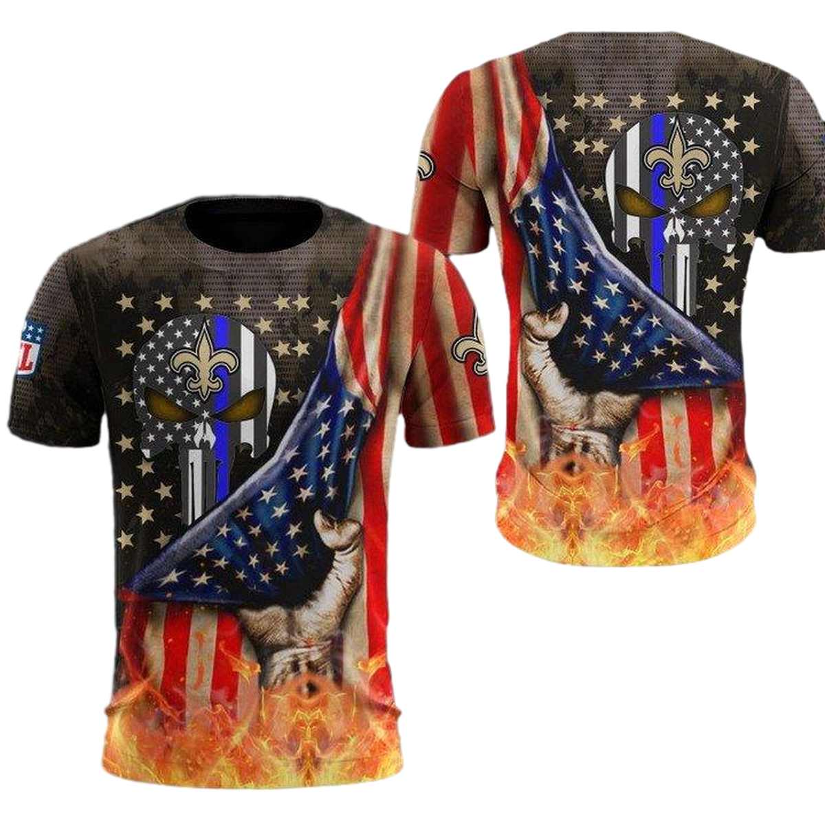 Show your spirit with our New Orleans Saints American Flag And Punisher Skull AOP T-shirt, a perfect blend of bold design and casual style. Ideal for devoted fans and fashion-forward individuals alike, this shirt is the ultimate choice for game days, casual outings, or making a statement anywhere you go. Its striking graphic and all-over print make it a standout piece in any wardrobe.
