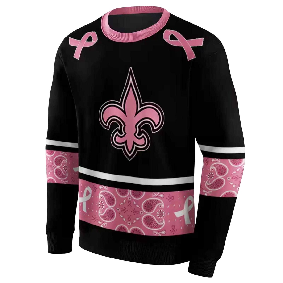 Show your support for a cause close to your heart with our New Orleans Saints Awareness Ribbon Black Pink AOP Sweatshirt. Designed for the bold and the passionate, this sweatshirt is perfect for casual outings, game days, or simply lounging at home. Its unique all-over print not only makes a statement but also adds a modern edge to your streetwear collection.