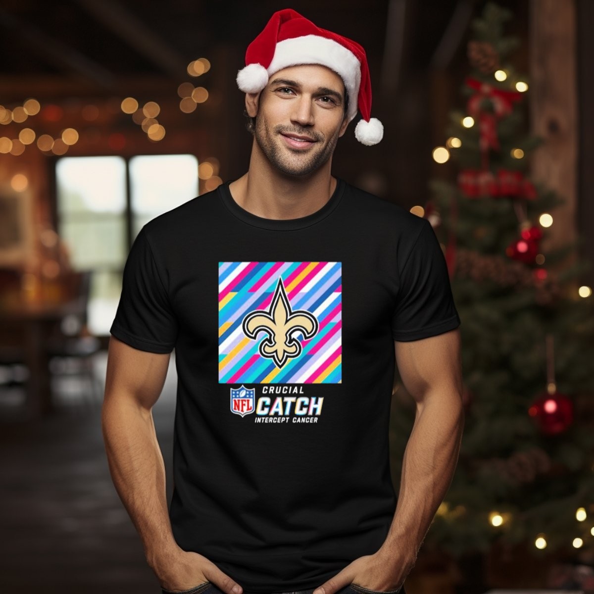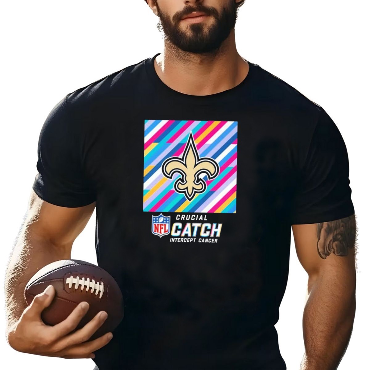 Show your unwavering support for the New Orleans Saints while raising awareness for a great cause with our Crucial Catch Intercept Cancer T-Shirt. This fan-made design features the iconic Fleur De Lis and bold stripes, making it the perfect choice for die-hard Saints fans. Ideal for casual wear, themed events, or daily outings, this shirt combines style and purpose, allowing you to showcase your team spirit while promoting cancer awareness. Printed in the USA, this tee is designed for comfort and durability, making it a must-have for every Saints supporter.