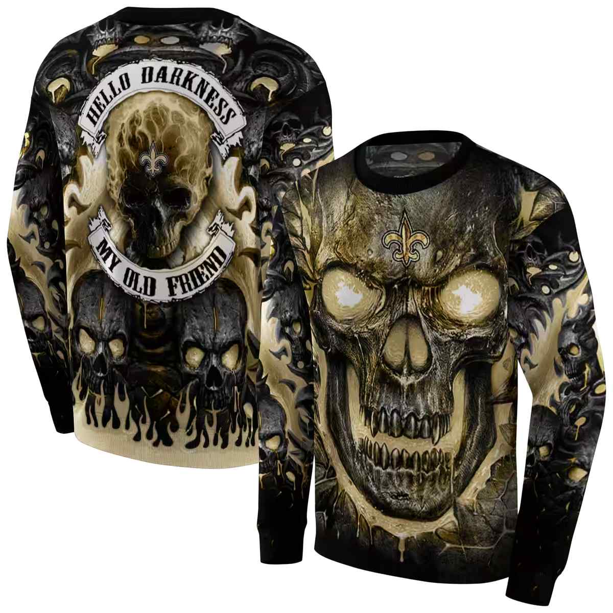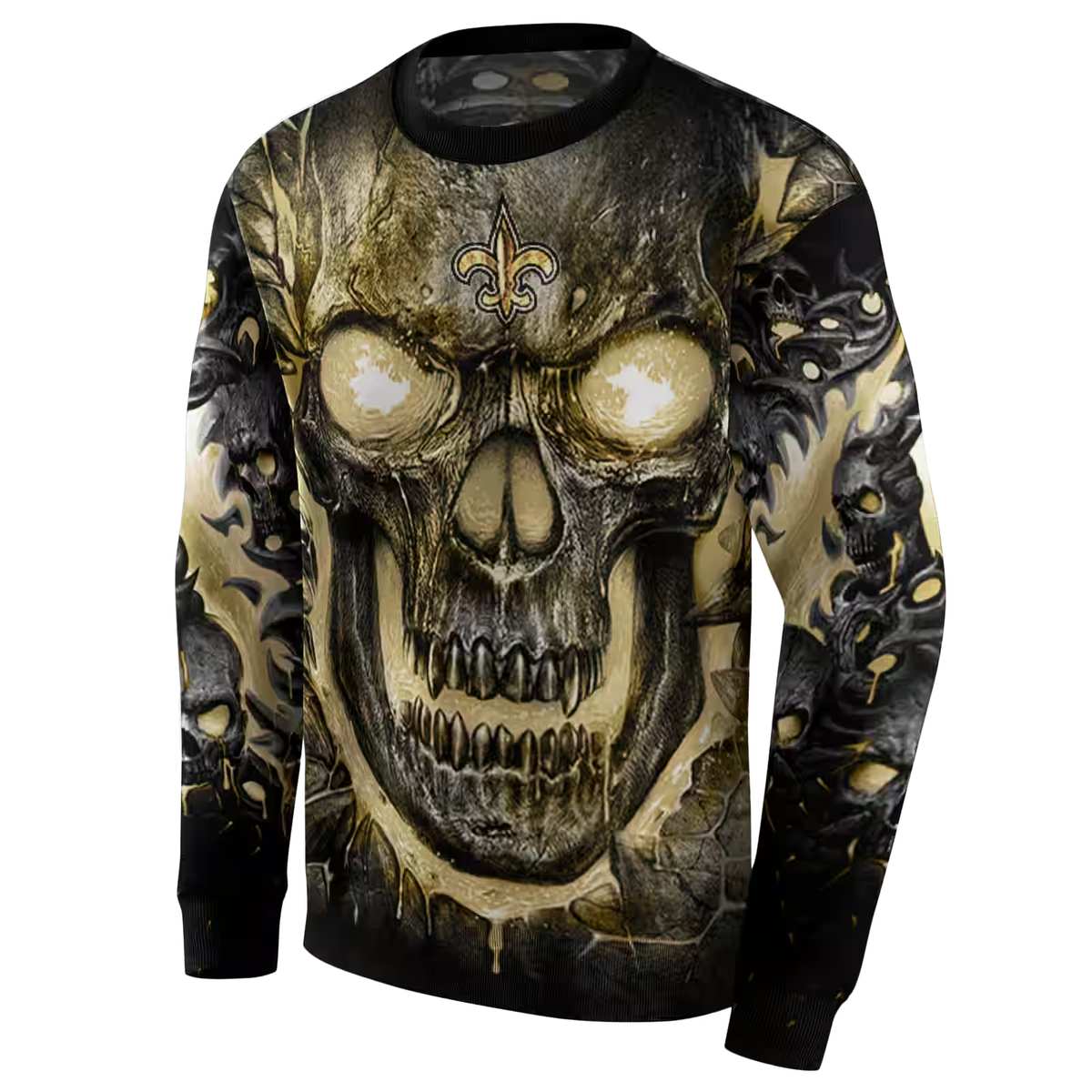 Embrace the spirit of New Orleans with our Demonic Skull Gold Black AOP Sweatshirt, a bold statement piece for fans and streetwear enthusiasts alike. Ideal for casual outings, game days, or simply lounging at home, this sweatshirt seamlessly blends comfort with a striking graphic design that showcases your fierce loyalty.