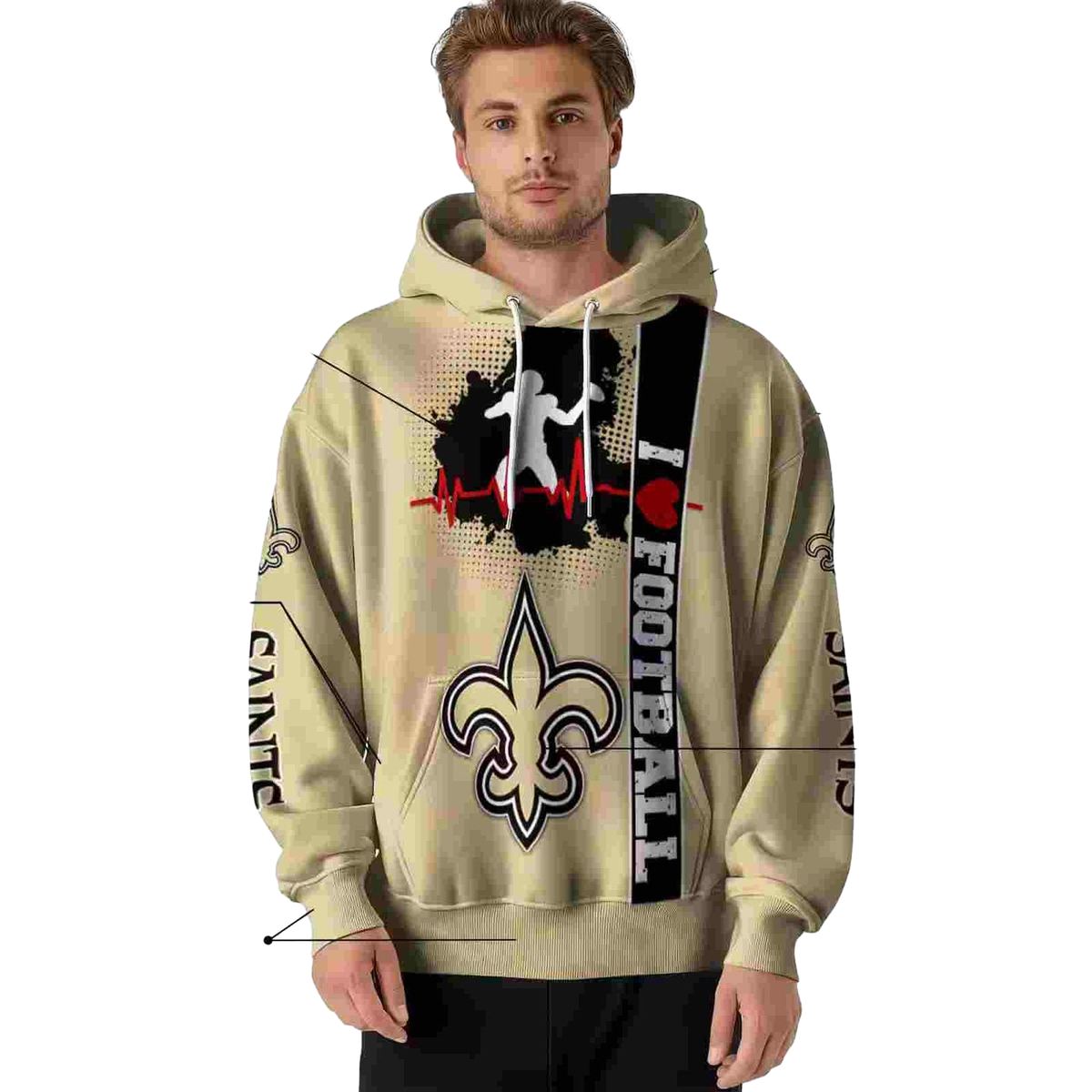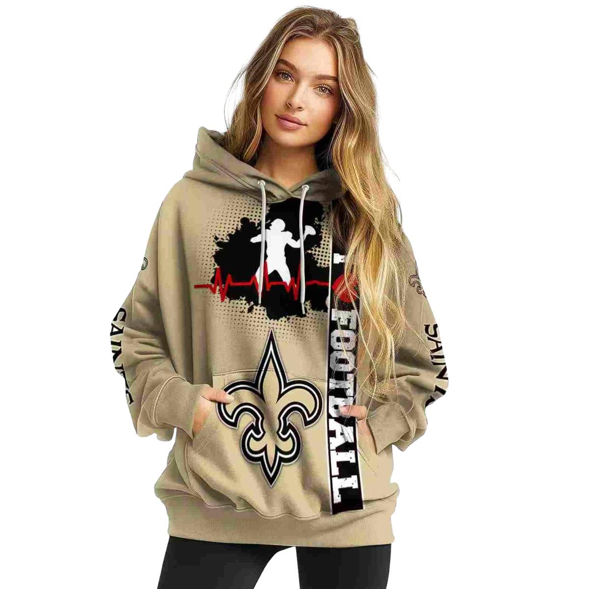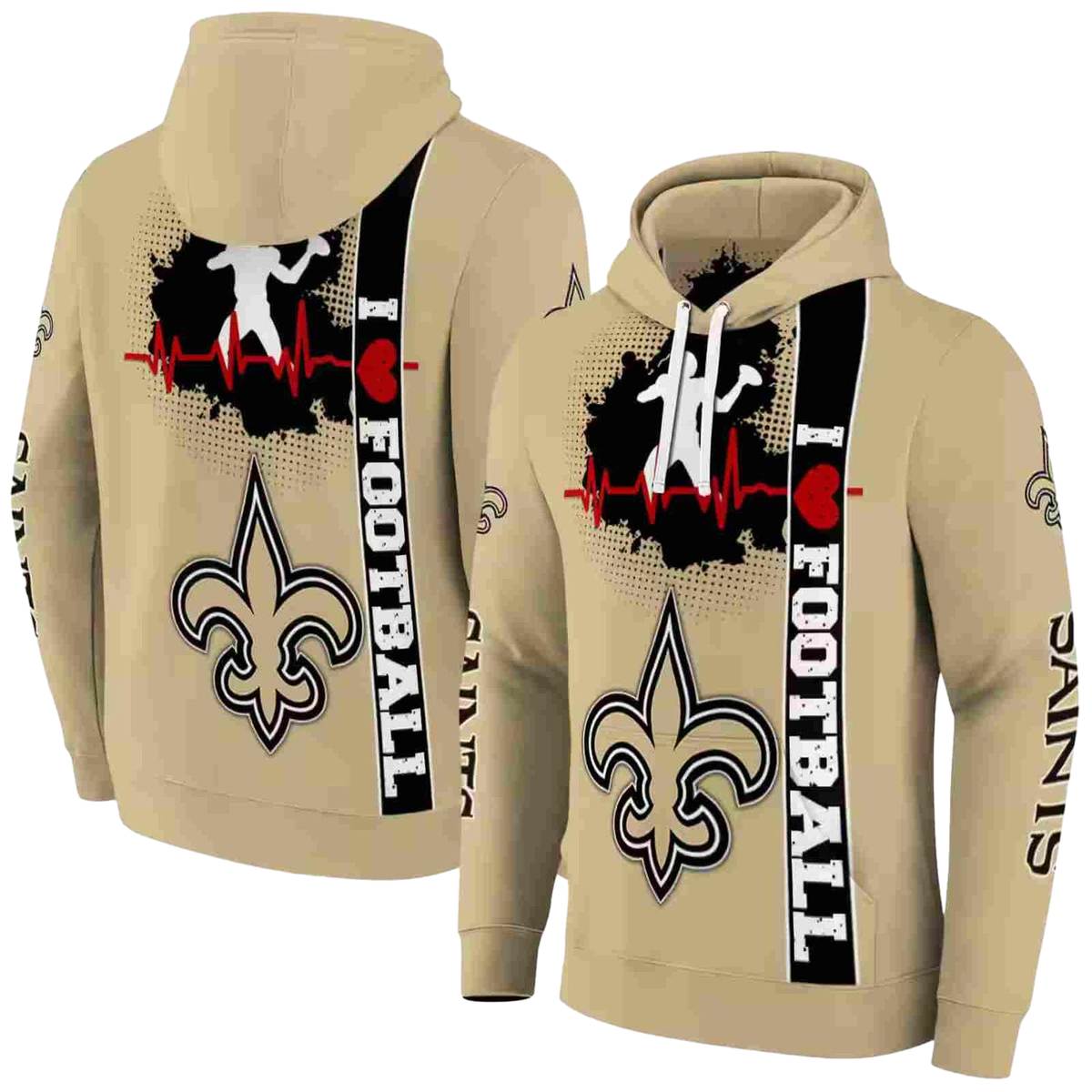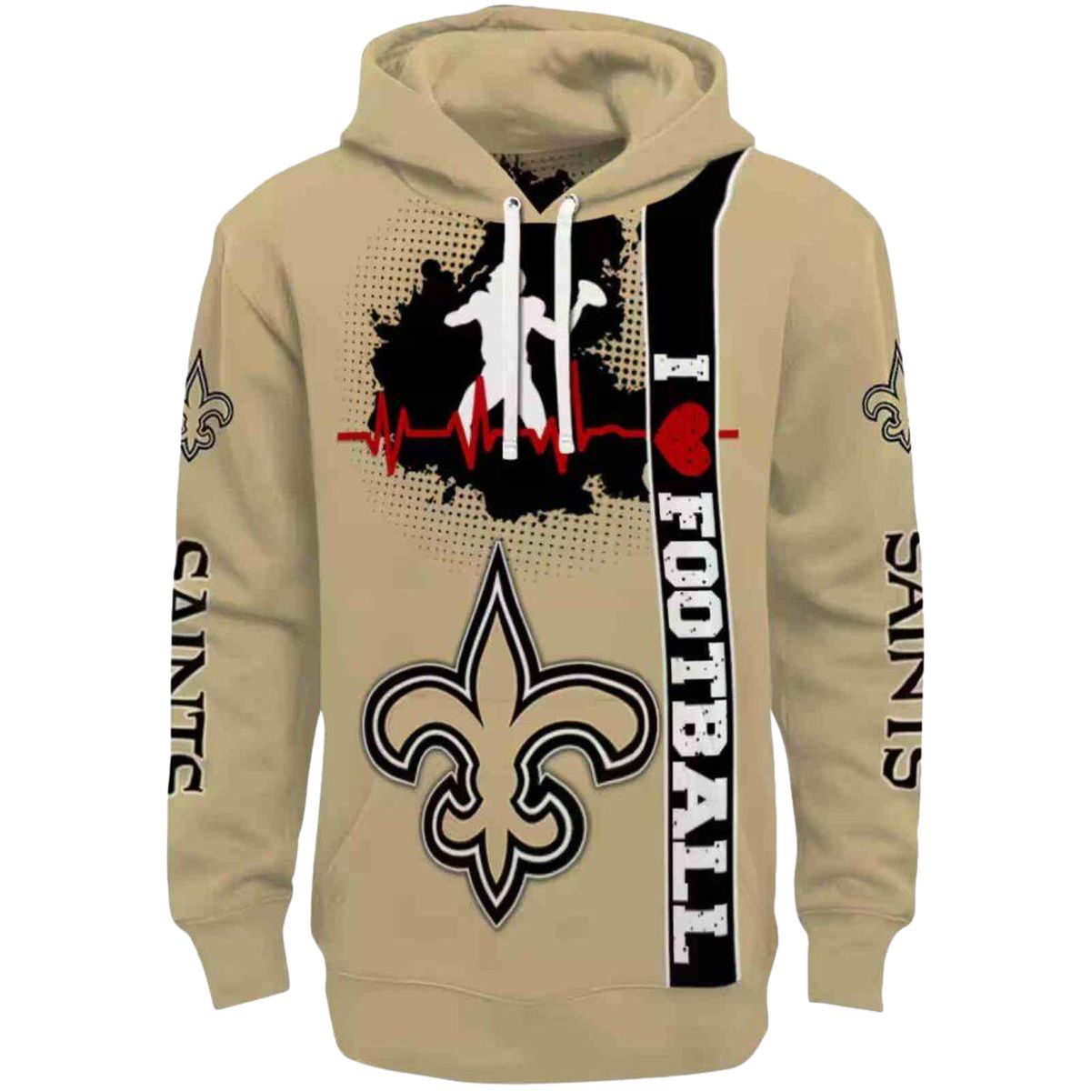 Show your unwavering support for the New Orleans Saints with our Football Heartbeat Gold All-Over Print Hoodie. Perfect for fans who want to flaunt their team spirit, this cozy yet lightweight hoodie is ideal for casual outings, game days, or simply lounging at home. Its unique all-over print design sets it apart, making it a standout piece in any fan’s wardrobe.