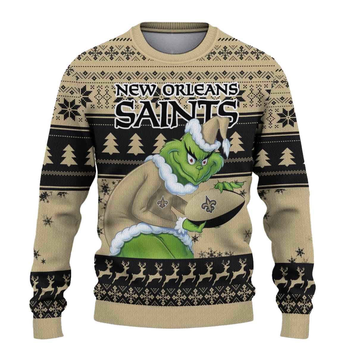Transform your winter wardrobe with our New Orleans Saints Grinch Stolen Ugly Sweater! Perfect for die-hard fans and holiday enthusiasts alike, this sweater brings a playful twist to your seasonal festivities. Wear it to game day gatherings, holiday parties, or while lounging at home — no matter the occasion, this sweater is sure to turn heads and spread cheer!
