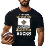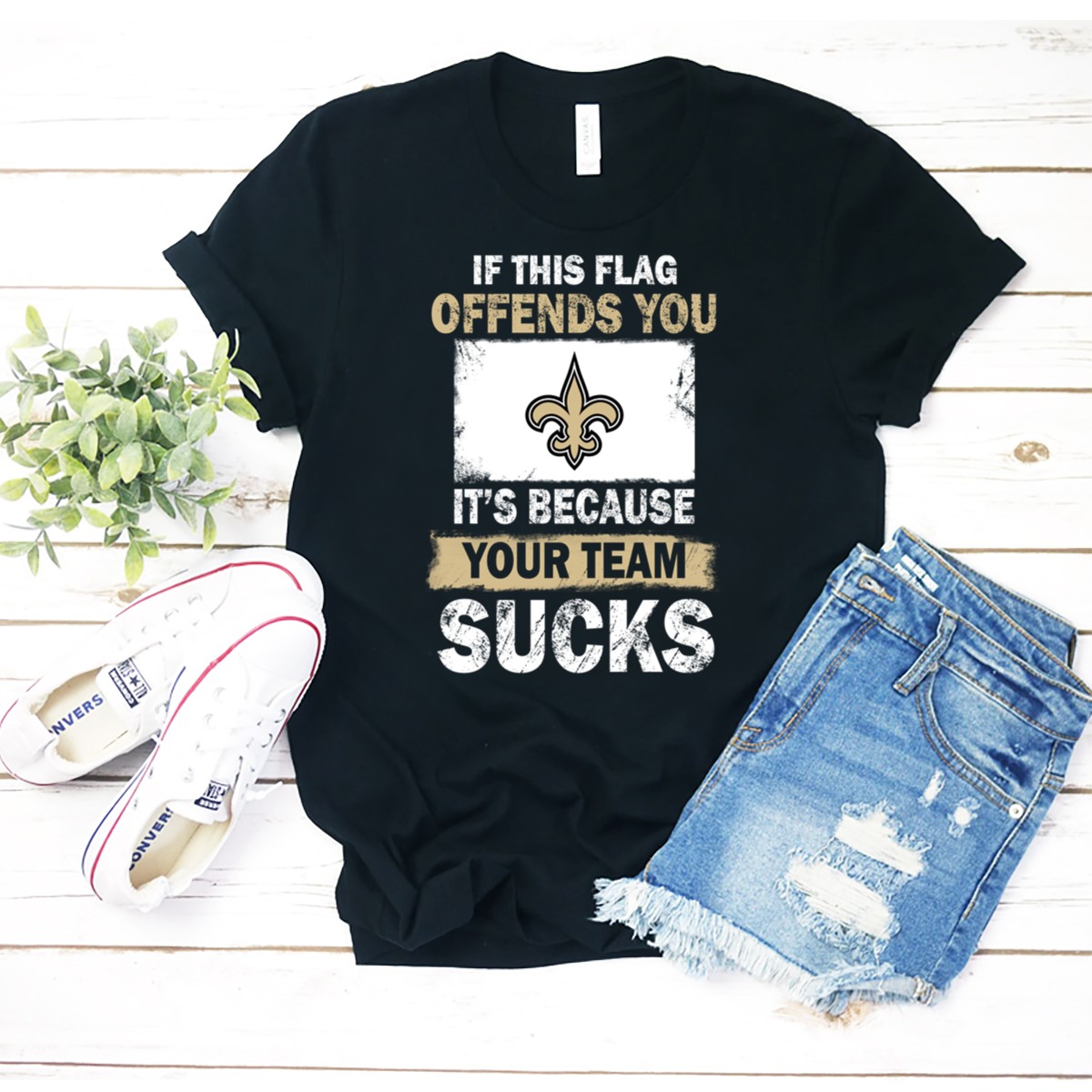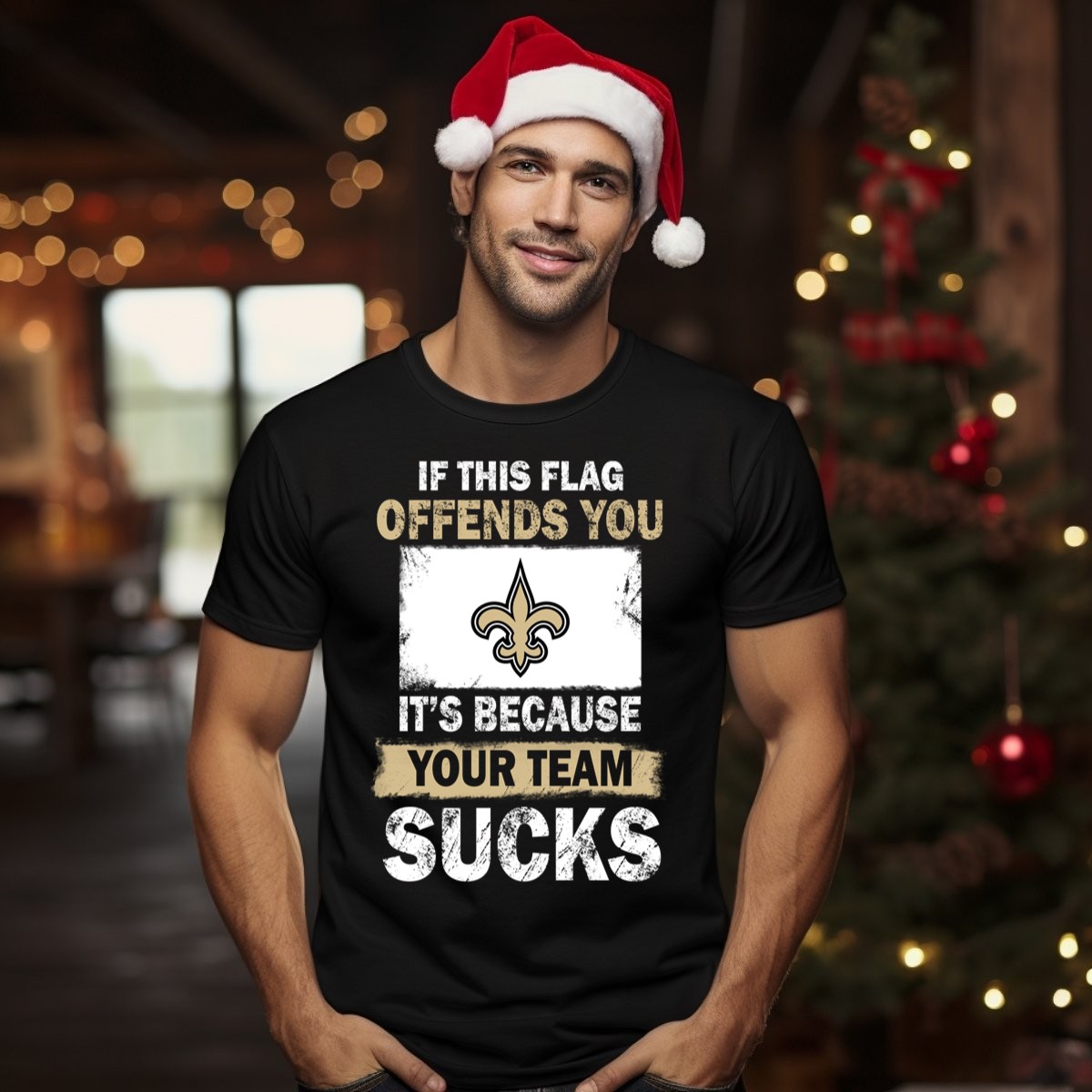 Show your true colors with the New Orleans Saints “If This Flag Offends You It’s Because Your Team Sucks” T-shirt! Designed for die-hard fans, this shirt is perfect for game days, casual outings, and themed events where you want to make a statement. Made with a fan-made design and printed in the USA, it combines comfort with a bold message, making it an essential addition to any Saints supporter’s wardrobe.