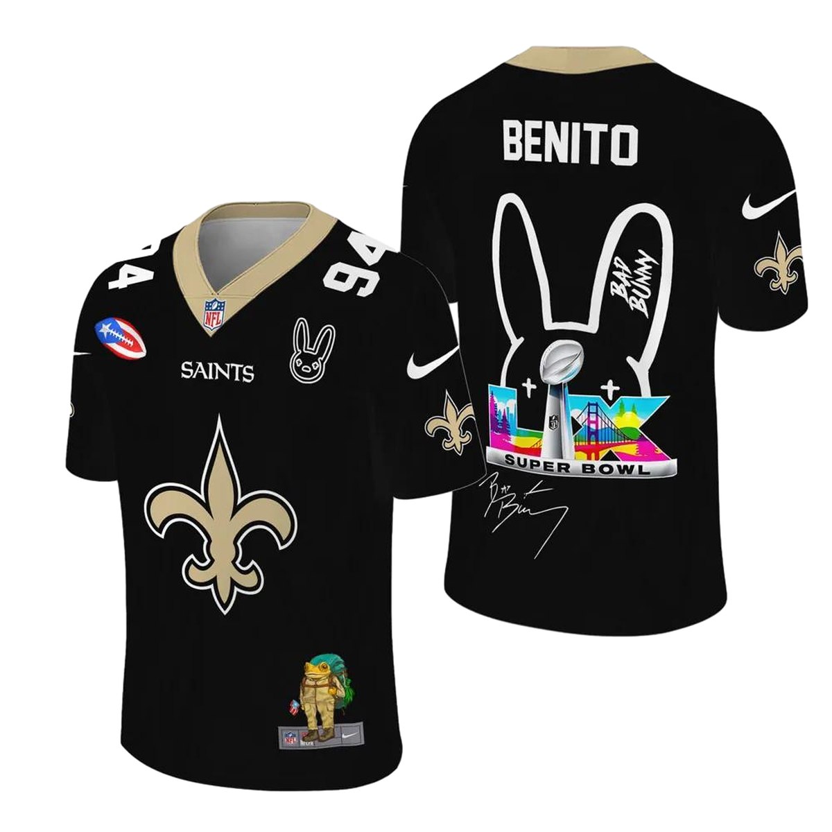Show your love for the New Orleans Saints and Bad Bunny with this vibrant all-over printed T-shirt! Perfect for fans and fashion enthusiasts alike, this shirt is ideal for casual outings, game days, or simply making a bold statement. Its unique graphic design sets it apart, allowing you to express your personality in style.