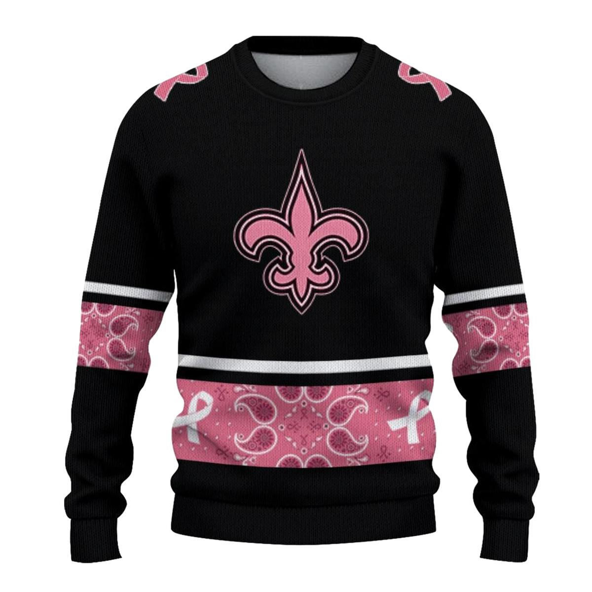 Show off your team spirit with this New Orleans Saints Logo Pink Ribbon Black Pink AOP Sweatshirt, perfect for fans who want to make a statement while staying cozy. Ideal for casual outings, gym sessions, or lounging at home, this sweatshirt combines style and comfort seamlessly, making it a versatile addition to your wardrobe.