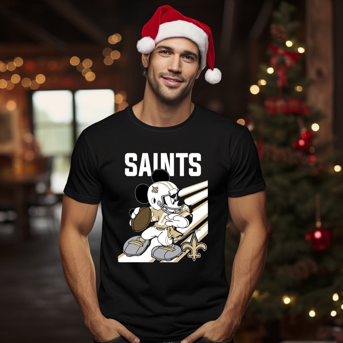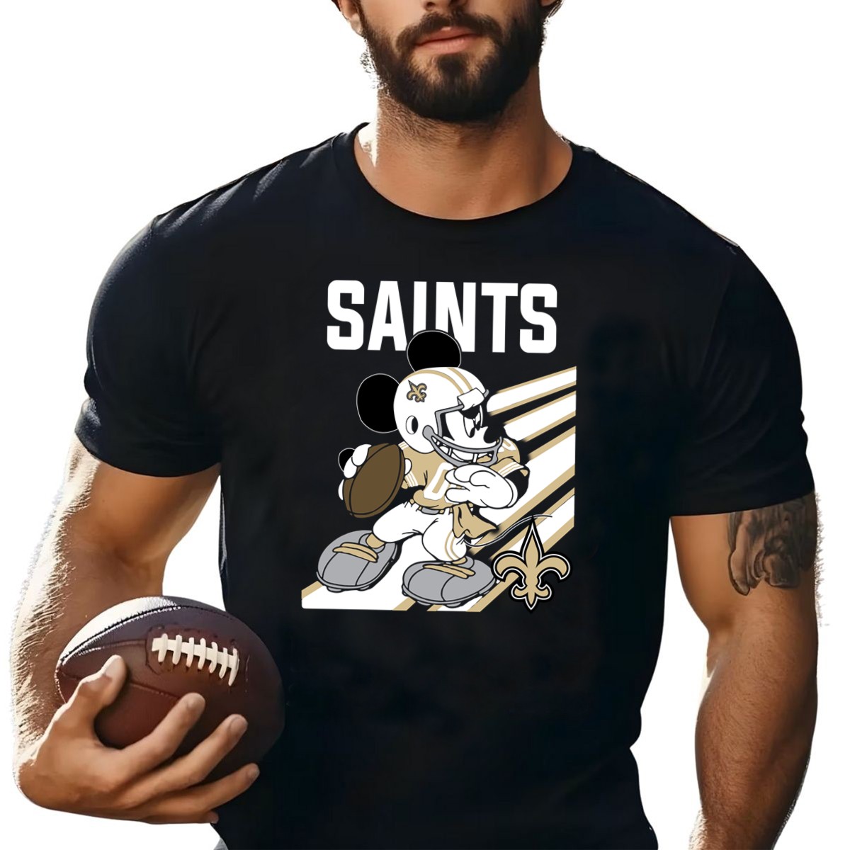 Celebrate your love for the New Orleans Saints and Disney with this unique fan-made Mickey Mouse NFL T-shirt! Perfect for die-hard fans and Disney enthusiasts alike, this shirt is ideal for casual wear at game day parties, themed events, or simply showing off your team spirit every day. Crafted with attention to detail, this shirt combines comfort and style, making it a standout piece in any wardrobe.