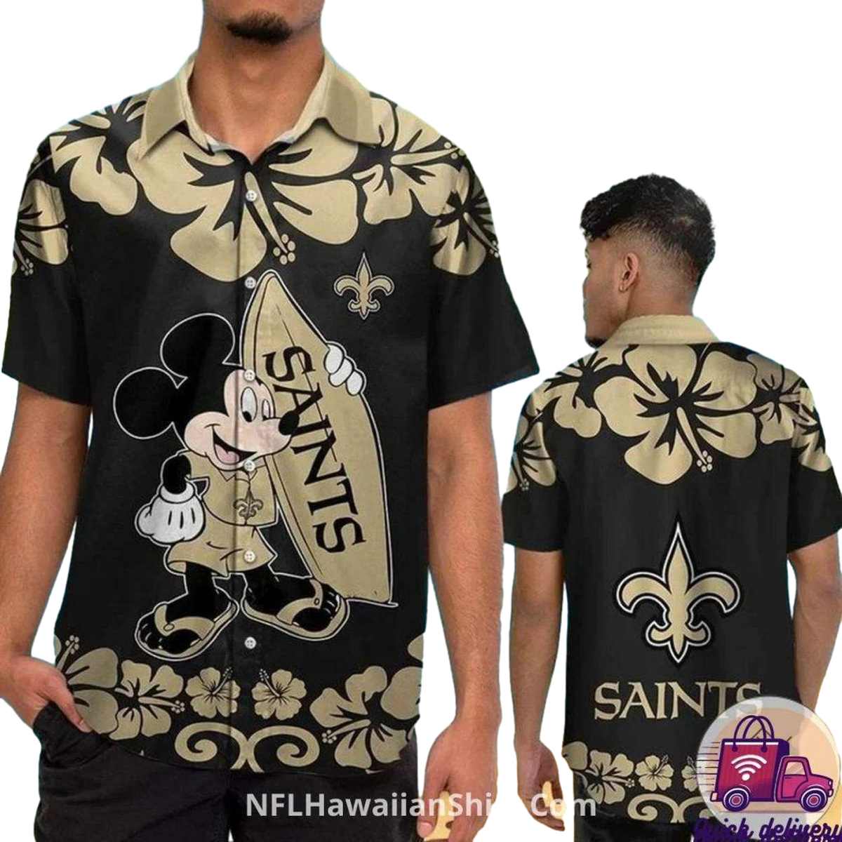 Embrace the vibrant spirit of summer with our New Orleans Saints Mickey Surfboard Gold Hibiscus Black Hawaiian Shirt, designed for fans who love to showcase their team pride in style. Perfect for beach outings, summer barbecues, or casual get-togethers, this shirt combines a playful graphic with a nod to your favorite team, making it a unique addition to any wardrobe.