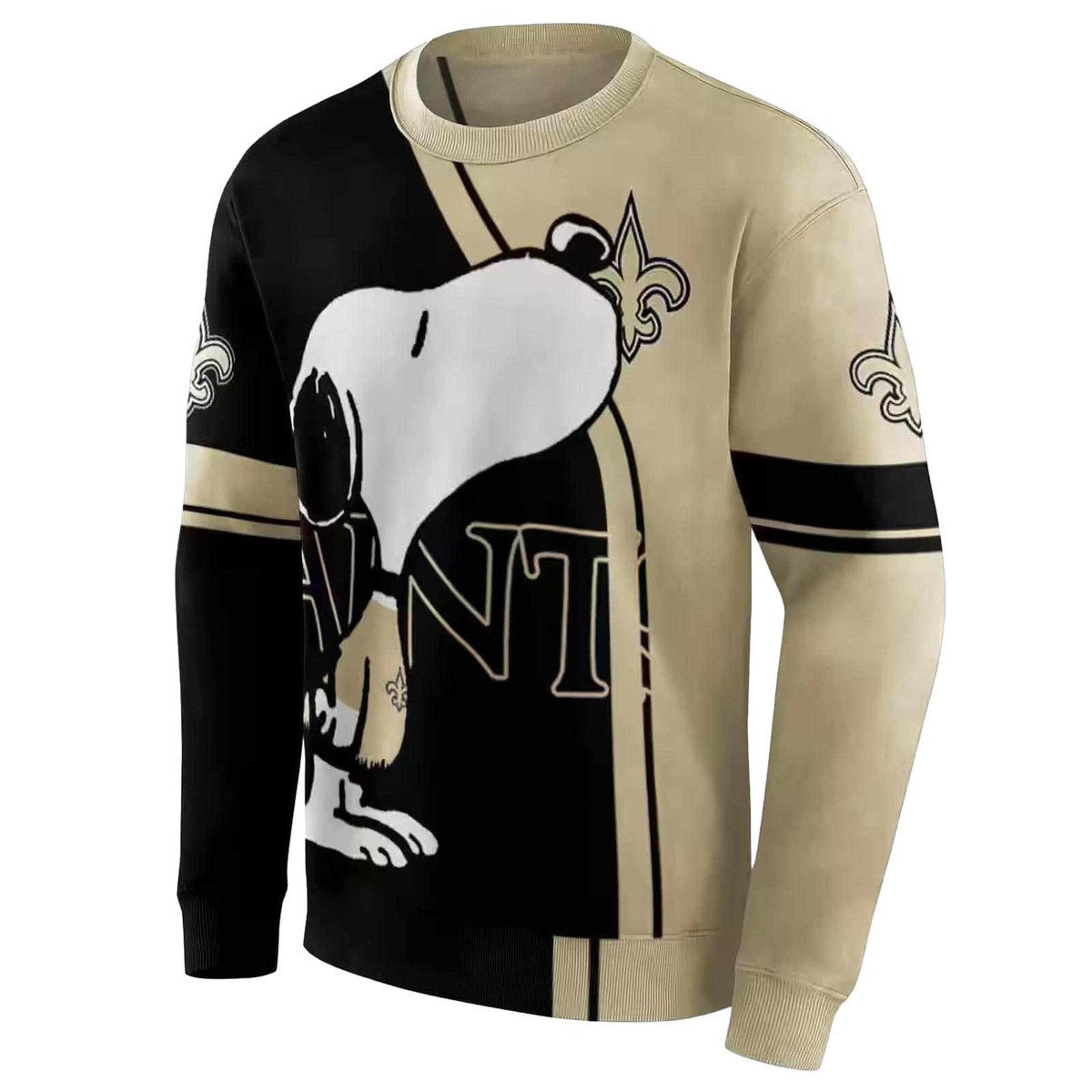 Show off your love for the New Orleans Saints and classic cartoons with our Playful Snoopy Gold Black All-Over Printed Sweatshirt. This unique piece is perfect for fans and fashion enthusiasts alike, making it an ideal choice for casual outings, game days, or lounging at home. With its vibrant design and relaxed fit, this sweatshirt combines comfort with a playful edge, ensuring you stand out in any setting.