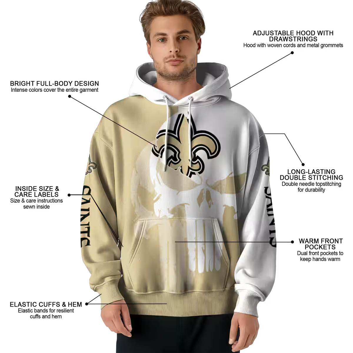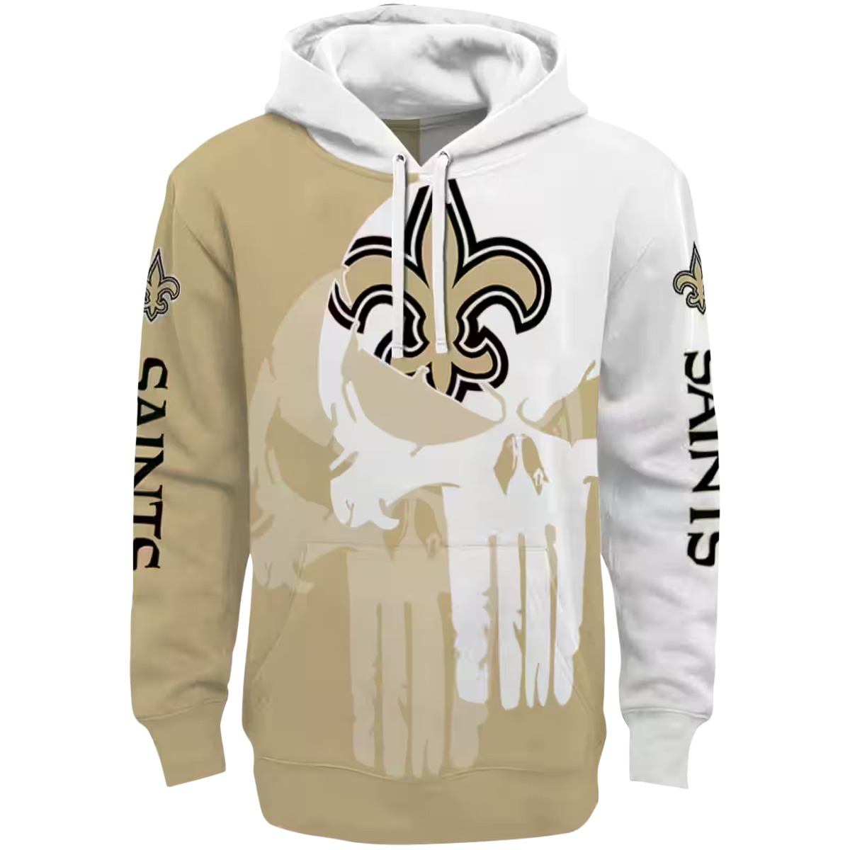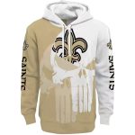 Unleash your team spirit with the New Orleans Saints Punisher Skull Gold White All-Over Print Hoodie. Perfect for die-hard fans and casual wearers alike, this hoodie offers a unique blend of style and comfort, making it an ideal choice for game days or relaxed outings. Its striking design showcases your loyalty while keeping you cozy in cooler weather.