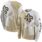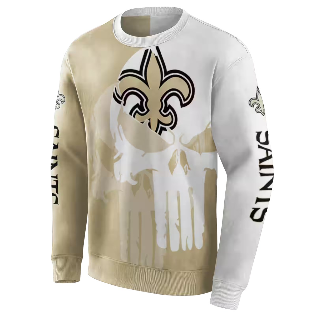 Introducing the New Orleans Saints Punisher Skull Gold White AOP Sweatshirt, the ultimate statement piece for die-hard fans and streetwear enthusiasts alike. This unique sweatshirt is perfect for game day, casual outings, or simply lounging at home, combining a bold graphic design with the comfort and warmth you crave. Its relaxed fit ensures it’s as stylish as it is cozy, making it a must-have for any wardrobe.