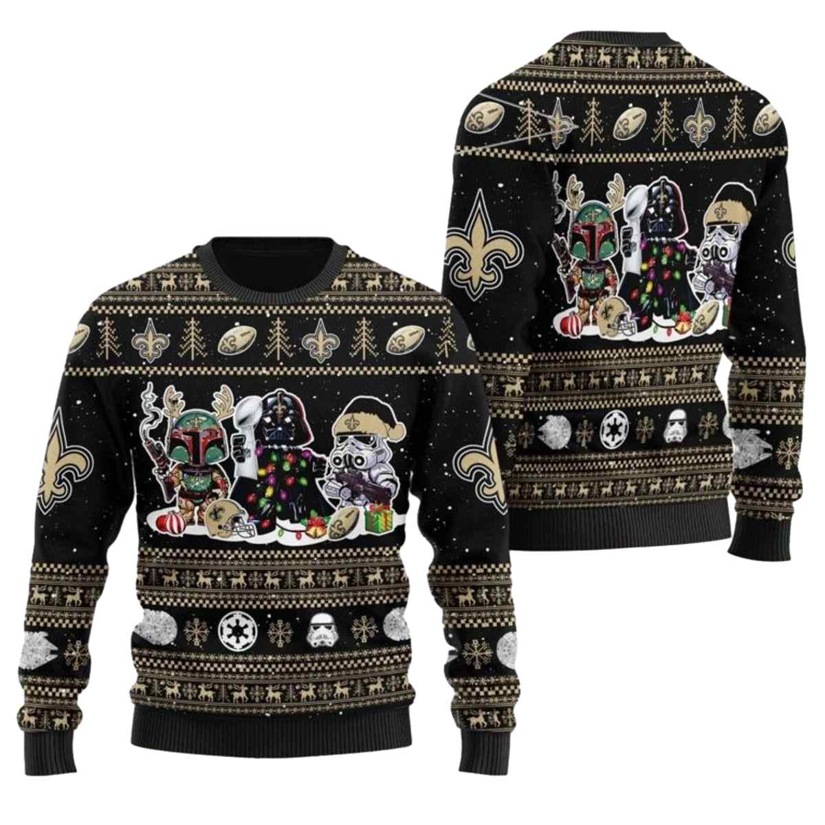 Bring a galaxy far, far away to your winter wardrobe with our New Orleans Saints Star Wars Ugly Sweater! Perfect for die-hard fans and holiday revelers alike, this quirky sweater combines the beloved themes of football and sci-fi, making it the ultimate conversation starter at parties or cozy nights in. Stand out in style and warmth while showing off your team spirit and love for the Force!