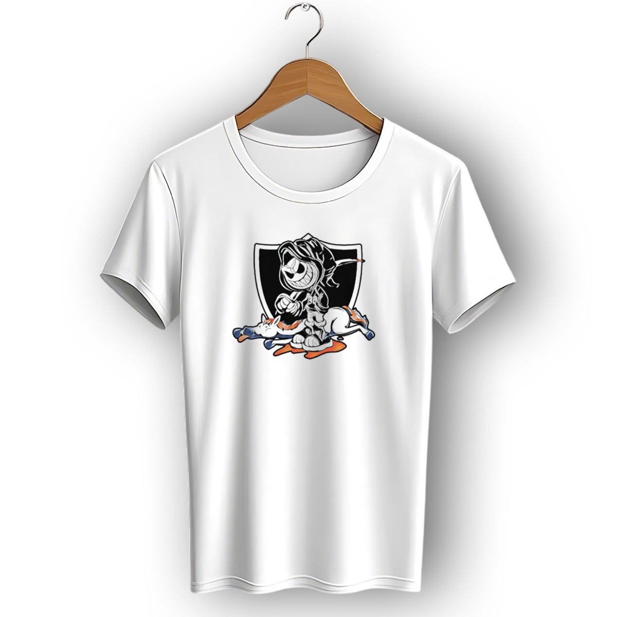 Show your team spirit with our “No Love For Denver” graphic T-shirt, featuring a striking Grim Reaper design that embodies the fierce rivalry between the Las Vegas Raiders and the Denver Broncos. Perfect for die-hard fans, this shirt is ideal for casual outings, themed events, or simply expressing your loyalty during game day. Made with quality materials and a unique fan-made design printed in the USA, it’s a must-have addition to any Raiders supporter’s wardrobe.