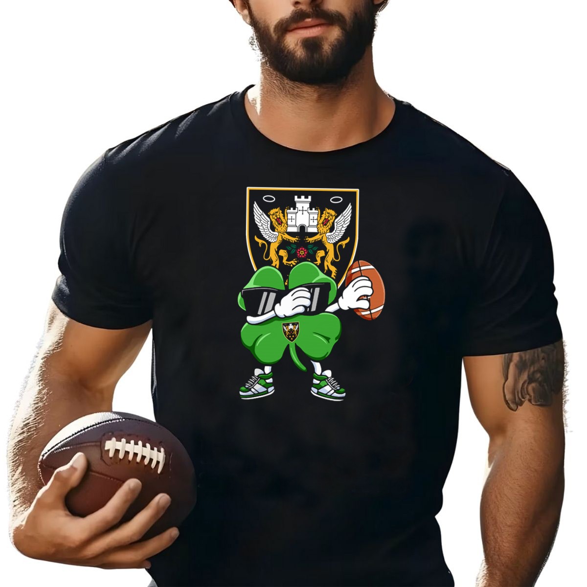 Show your unwavering support for the Northampton Saints with this stylishly designed T-shirt featuring the iconic club crest, a stylized shamrock, and a rugby ball. Perfect for passionate fans and rugby enthusiasts alike, this tee is ideal for casual outings, themed events, or simply showcasing your team pride in everyday life. Made for comfort and durability, it’s a must-have addition to any fan’s wardrobe!