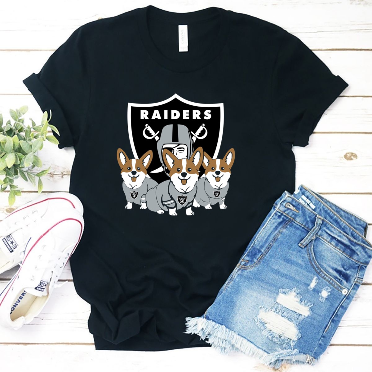Show off your love for both the Oakland Raiders and adorable corgis with this fun fan-made graphic T-shirt! Perfect for passionate fans and dog lovers alike, this shirt is designed for casual wear, whether you’re cheering from the stands, hanging out with friends, or just running errands. Made in the USA, it combines comfort and style, making it a unique addition to your everyday wardrobe.