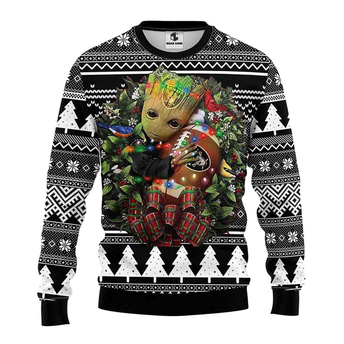 Get ready to embrace the holiday spirit with our Oakland Raiders Groot Hug Christmas Ugly Sweater! Perfect for die-hard fans and festive souls alike, this unique sweater brings together the love for football and the joy of the season. Ideal for holiday parties, cozy evenings at home, or cheering on your team, this sweater is designed to make you the life of the party while keeping you snug and stylish.