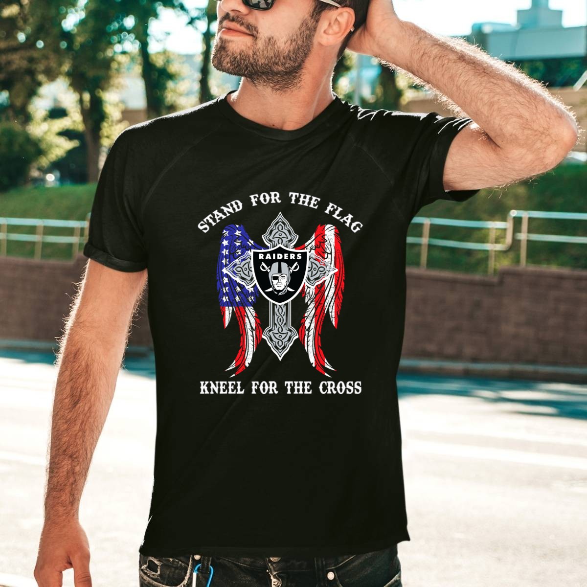 Show your unwavering support for the Oakland Raiders with this striking “Stand for the flag, kneel for the cross” T-shirt. Perfect for die-hard fans and those who appreciate bold statements, this shirt is ideal for casual outings, themed events, or simply showcasing your team pride in everyday life. Crafted with a fan-made design printed in the USA, it celebrates your love for the game while making a powerful statement.