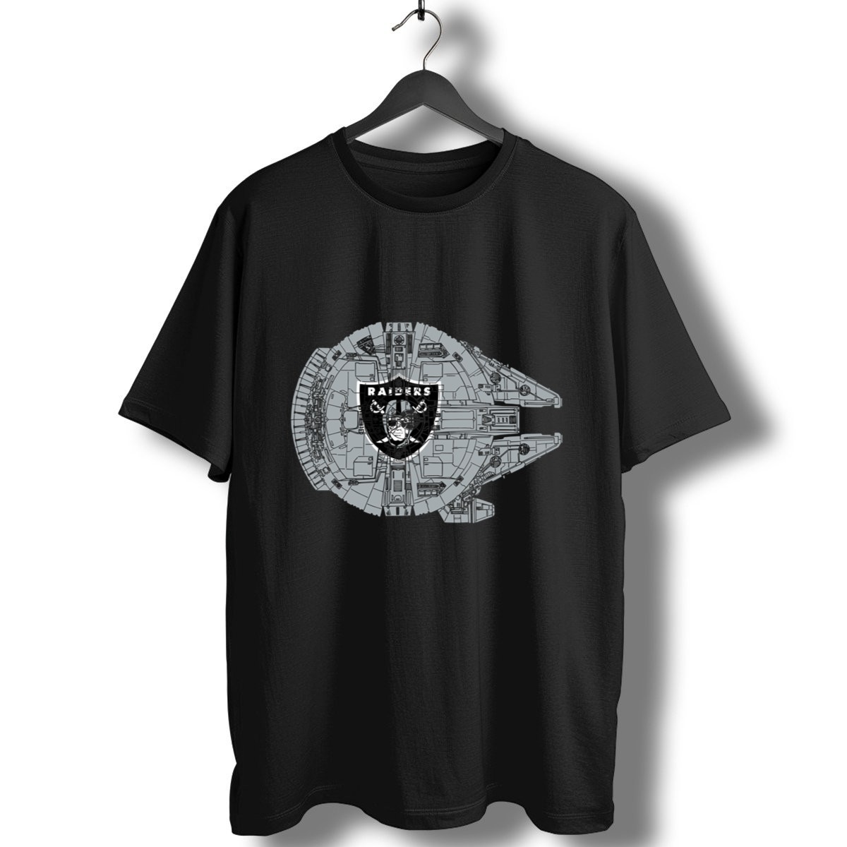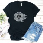 Show your love for both the Oakland Raiders and the epic saga of Star Wars with this unique fan-made T-shirt featuring the iconic Millennium Falcon. Perfect for die-hard fans and casual wearers alike, this shirt is ideal for game days, themed events, or simply expressing your fandom in everyday life. Made with a soft and breathable fabric, it promises comfort while showcasing a design that merges two legendary universes.