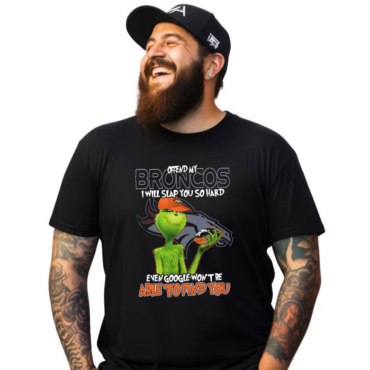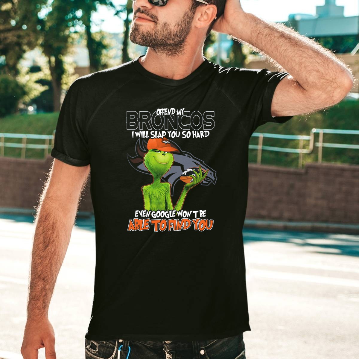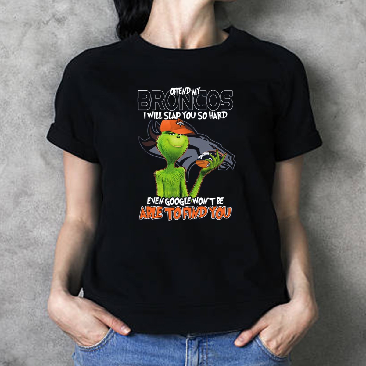 Show your unwavering support for the Denver Broncos with our fan-made “Offend My Broncos I Will Slap You So Hard Even Google Won’t Be Able To Find You Grinch V2” T-shirt. Perfect for die-hard fans and casual wearers alike, this humorous design is ideal for game days, tailgating, or just lounging around while you cheer on your team. Crafted for comfort and style, this shirt makes a bold statement while keeping you cozy during all seasons.