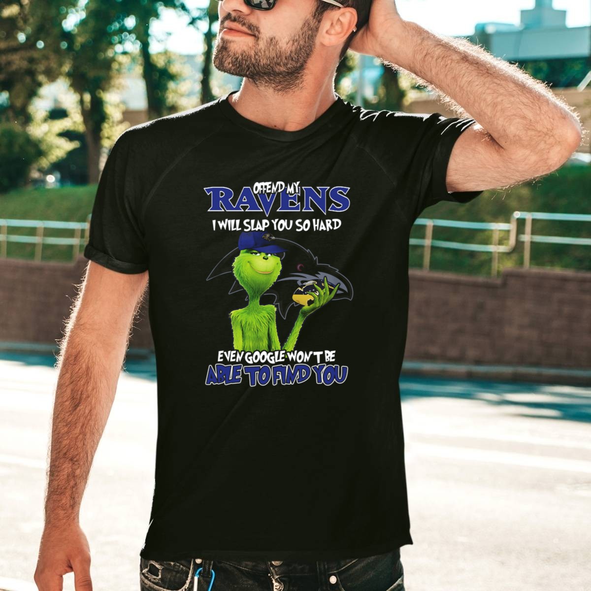 Show your unwavering support for the Baltimore Ravens with our fan-made “Offend My Ravens I Will Slap You So Hard Even Google Won’t Be Able To Find You Grinch V2” T-shirt. This graphic printed tee is perfect for die-hard fans who love to make a bold statement. Whether you’re cheering from the stands, attending themed events, or just hanging out with friends, this shirt blends comfort with a touch of humor to keep your spirit high all season long.