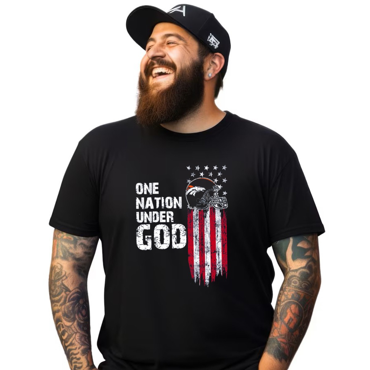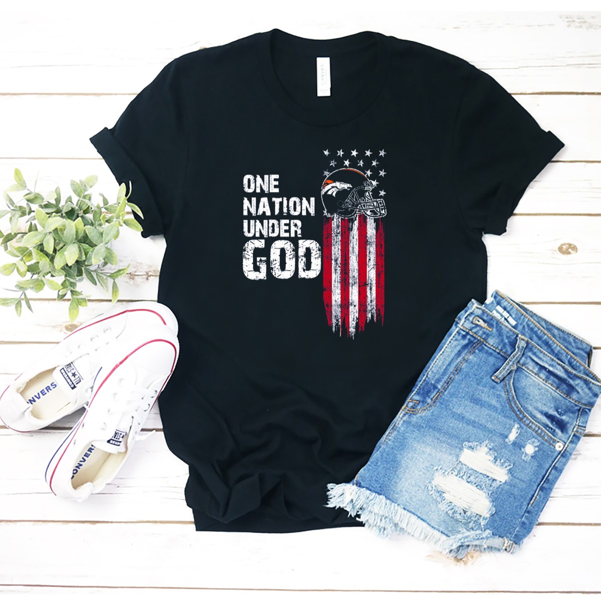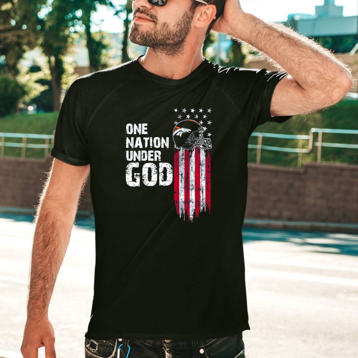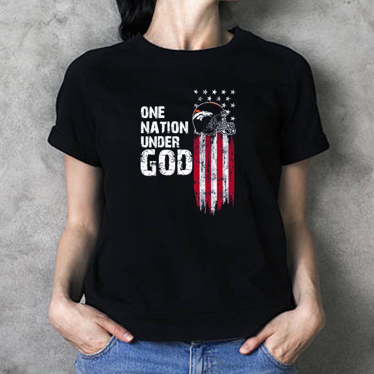 Show your pride and passion for the Denver Broncos with our One Nation Under God T-shirt, a perfect blend of team spirit and patriotic flair. This fan-made design features the iconic American flag with a bold Broncos helmet, making it an ideal choice for game days, casual outings, or themed events. Crafted for comfort and style, this classic fit tee is not just a shirt; it’s a statement of loyalty and love for your team, printed right here in the USA.