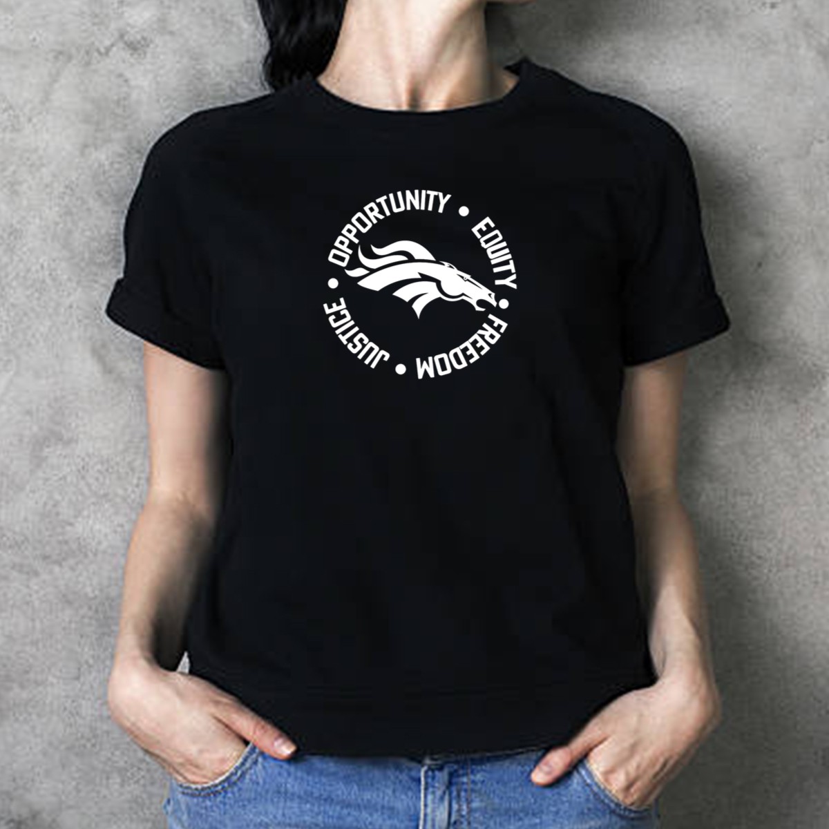 Celebrate your passion for the Denver Broncos with our Opportunity Equity Freedom Justice T-Shirt, designed for true fans who want to showcase their team spirit in style. This graphic printed tee is perfect for casual outings, themed events, or daily wear, offering a unique and bold statement that resonates with the values of empowerment and justice. Made with love in the USA, this shirt combines comfort and durability, making it an essential addition to any Broncos supporter’s wardrobe.