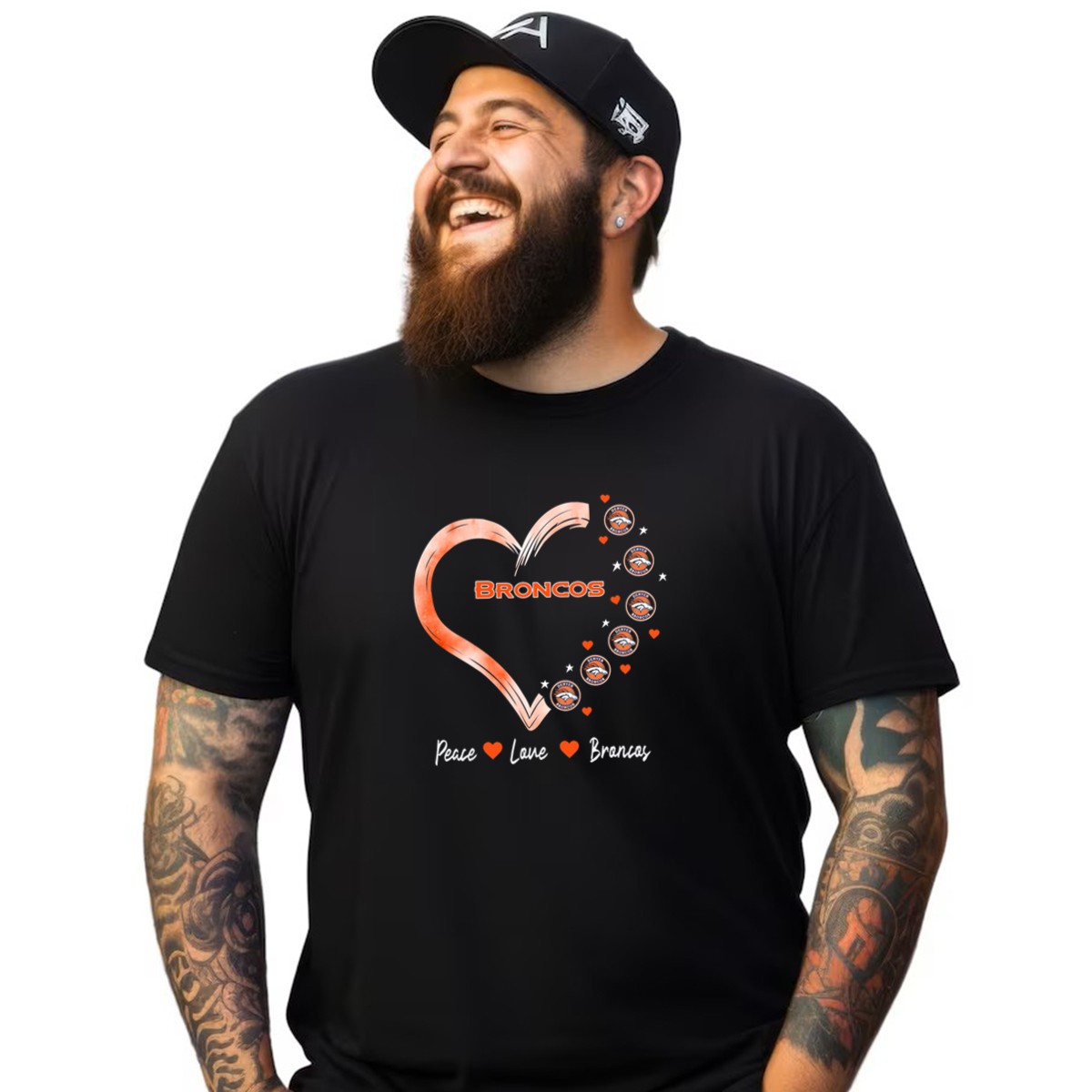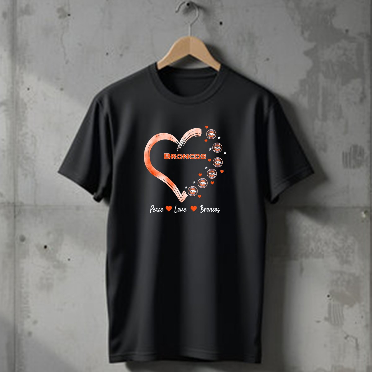 Show your love for the Denver Broncos with this stylish and vibrant “Peace Love Broncos Heart” T-shirt! Perfect for dedicated fans, this shirt combines team spirit with a heartwarming design, featuring the iconic Broncos logos and stars. Whether you’re cheering from the stands, attending a casual gathering, or just enjoying daily wear, this shirt is a fantastic way to express your passion for the game while staying comfortable and fashionable.