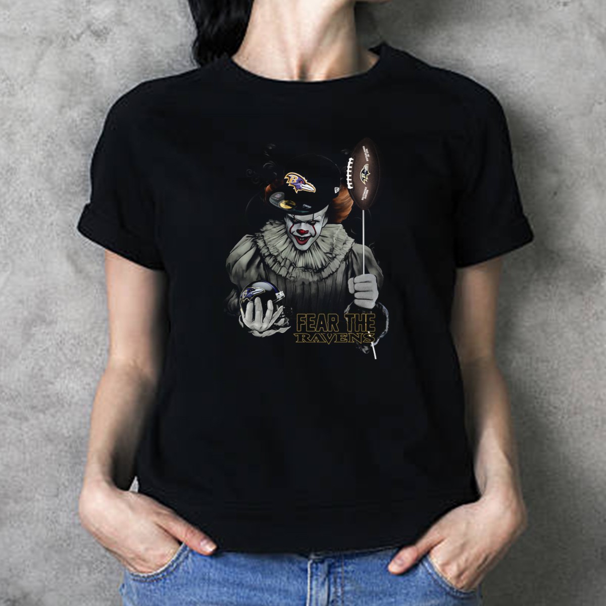 Unleash your inner fan with our Pennywise Holding Baltimore Ravens Football And Helmet Fear The Ravens T-Shirt! This unique graphic tee combines the thrilling essence of your favorite horror character with the passion of Ravens football, making it the perfect choice for die-hard fans and horror enthusiasts alike. Whether you’re at a game, a themed event, or just hanging out with friends, this shirt ensures you stand out in style while showing off your team spirit. Printed in the USA, it’s a must-have addition to your casual wear collection!