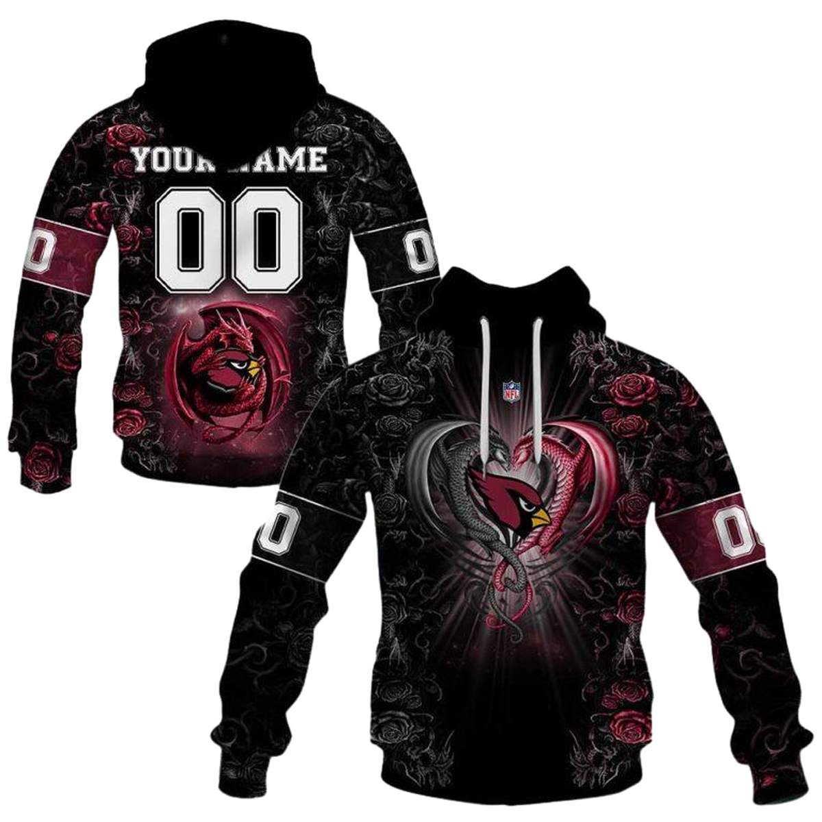 Embrace your passion for the Arizona Cardinals with our Personalized Arizona Cardinals Rose Dragon All-Over Print Hoodie. Perfect for fans who want to showcase their team spirit, this hoodie is designed for everyday wear and casual outdoor activities during the winter months. Its unique graphic print featuring a fierce rose dragon adds a distinctive touch, making it a standout piece in any wardrobe.