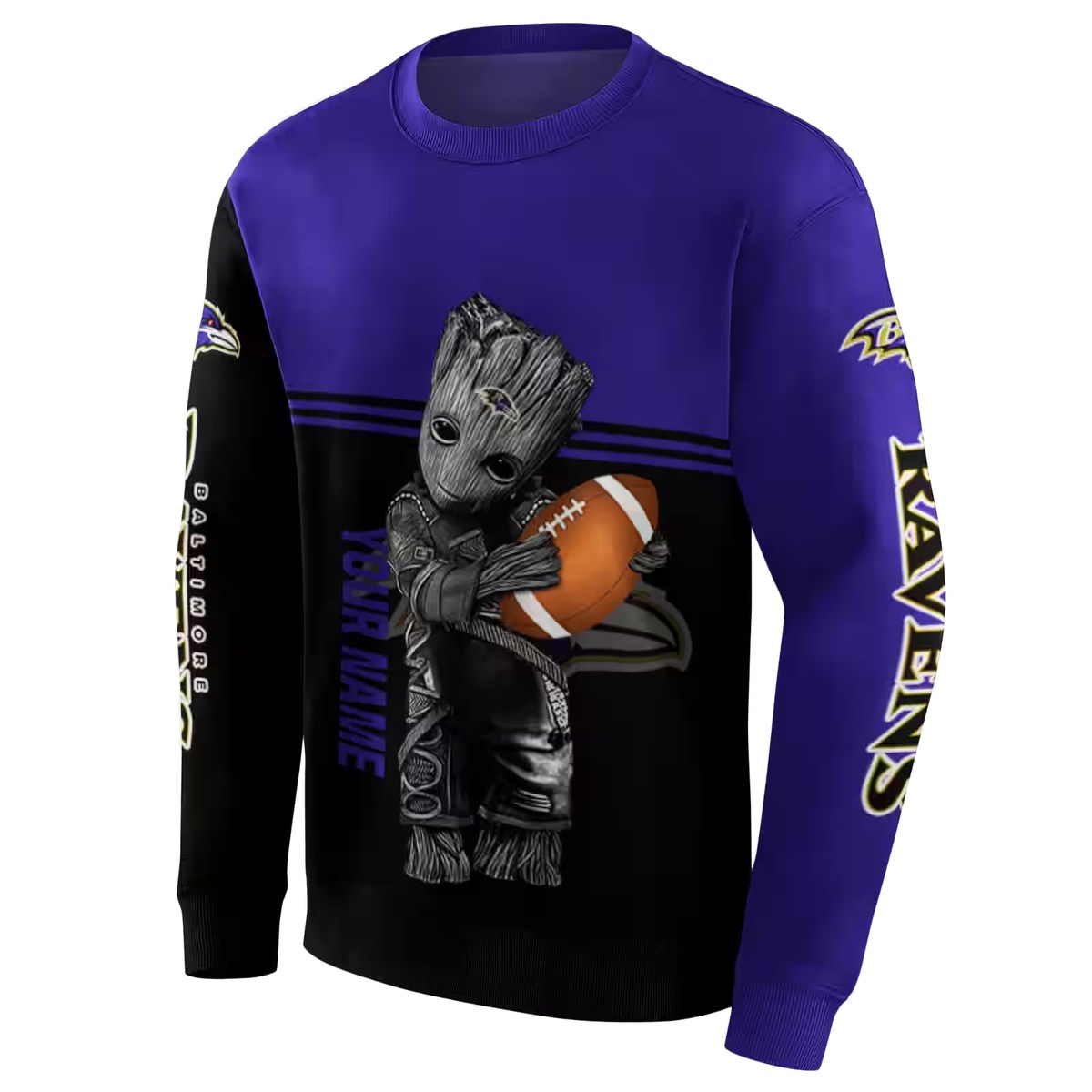 Embrace your love for the Baltimore Ravens with this unique Personalized Baby Groot AOP Sweatshirt. Perfect for fans of all ages, this stylish piece effortlessly combines comfort and streetwear flair. Whether you’re heading to a game, hanging out with friends, or just lounging at home, this sweatshirt is designed to keep you cozy while showcasing your team spirit in a fun and vibrant way.