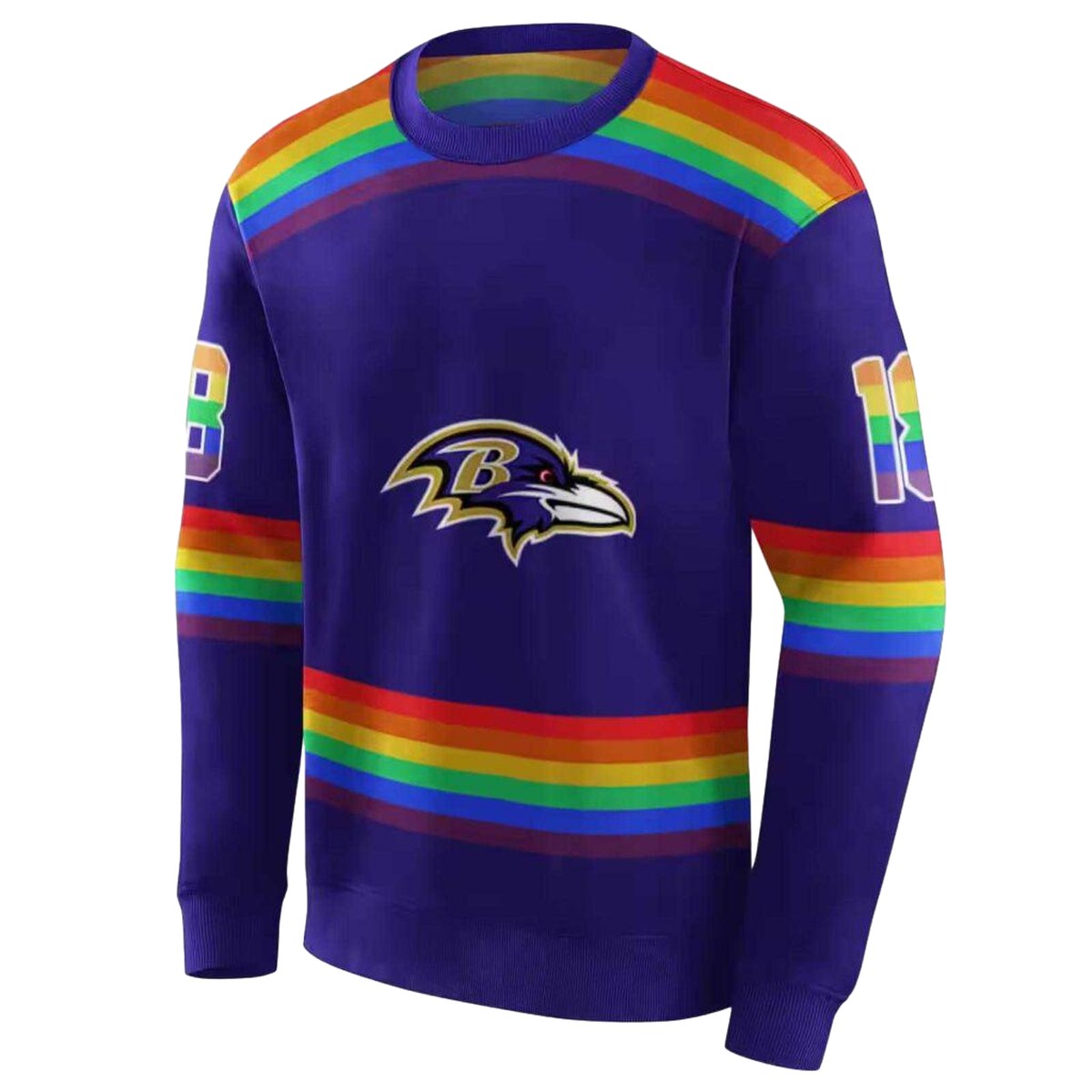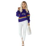 Embrace your team spirit with our Personalized Baltimore Ravens Rainbow Stripes Purple AOP Sweatshirt, designed for every dedicated fan. Perfect for casual outings, cozy nights at home, or cheering on your favorite team, this sweatshirt brings a vibrant twist to your streetwear collection. With its eye-catching all-over print and relaxed fit, it’s not just a garment; it’s a statement piece that showcases your love for the Ravens in style.