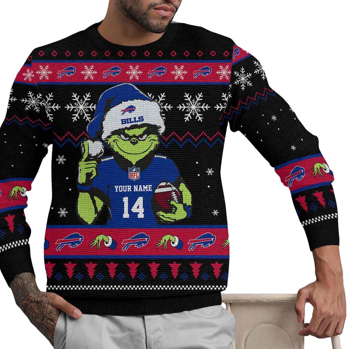 Get ready to bring some holiday cheer with our Personalized Buffalo Bills Grinch Santa Claus Ugly Sweater! Perfect for fans of the Bills who love to add a twist of fun to their winter wardrobe, this sweater is ideal for game day parties, cozy nights in, or festive gatherings. With its unique design featuring the Grinch in a Bills theme, you’ll stand out while spreading joy and laughter wherever you go!