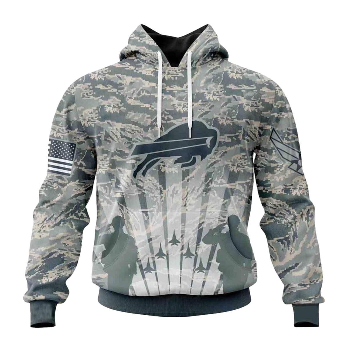 Celebrate your pride and support for the Buffalo Bills and the brave men and women of the US Air Force with this eye-catching all-over print hoodie. Perfect for fans and veterans alike, this cozy yet lightweight hoodie is ideal for daily wear or casual outdoor activities during the winter months. Its unique design makes it a standout piece that expresses your passion while keeping you comfortable.