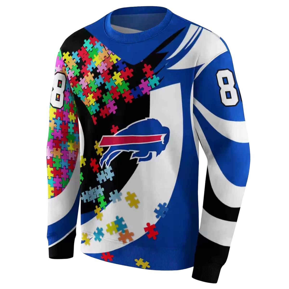 Introducing the Personalized Buffalo Bills Puzzle Pieces Blue AOP Sweatshirt, a must-have addition for every die-hard fan! This stylish sweatshirt is perfect for game days, casual outings, or simply lounging at home while showcasing your team spirit. With its unique all-over print design, this sweatshirt stands out in any crowd, making it an essential piece for those who live and breathe Buffalo Bills pride.