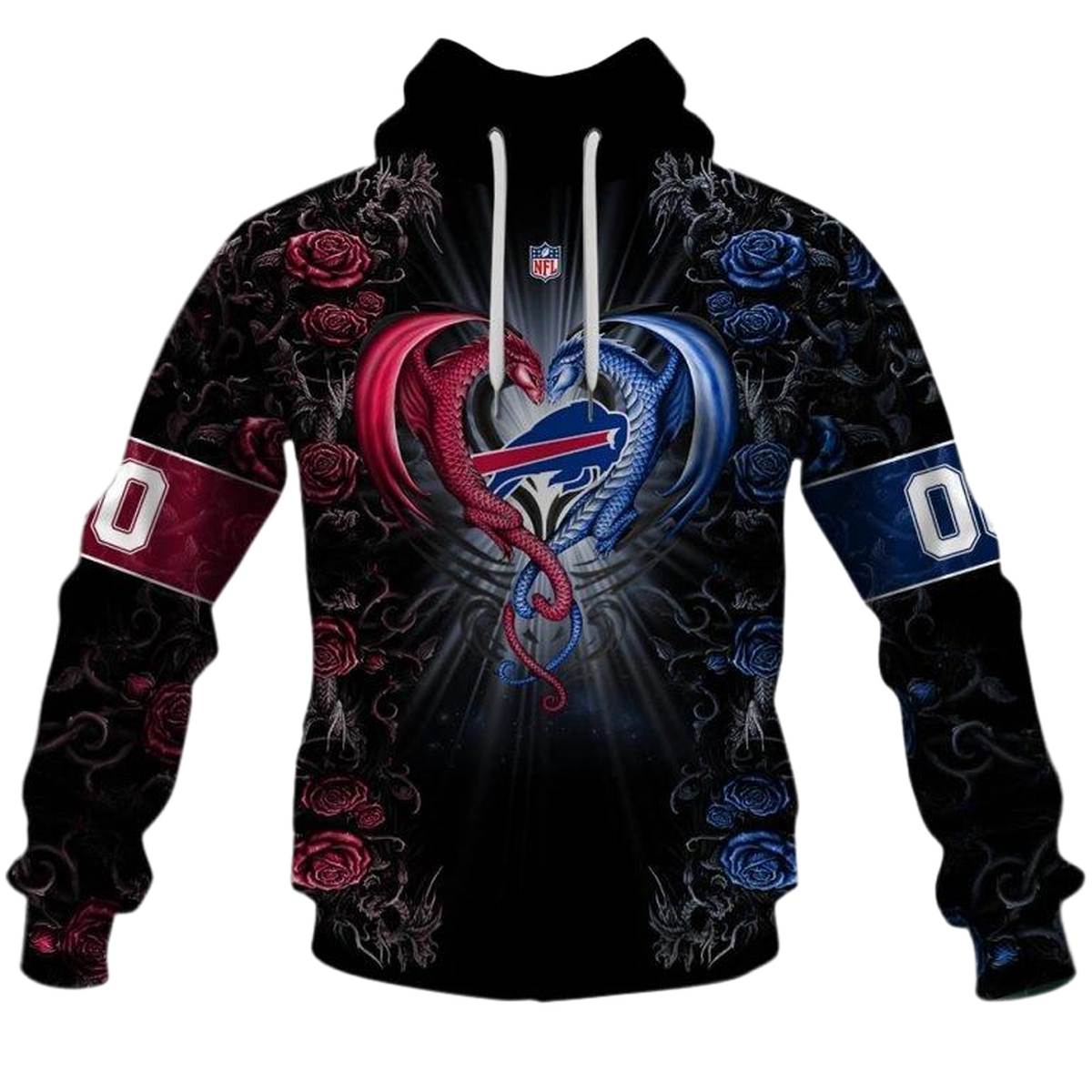 Introducing the Personalized Buffalo Bills Rose Dragon All-Over Print Hoodie, a unique blend of style and comfort designed for die-hard fans and casual wearers alike. Perfect for game day or a cozy night in, this hoodie showcases your passion with a stunning graphic that makes a statement. Its relaxed unisex fit means it’s great for anyone looking to add a touch of personality to their wardrobe while staying warm during the cooler months.