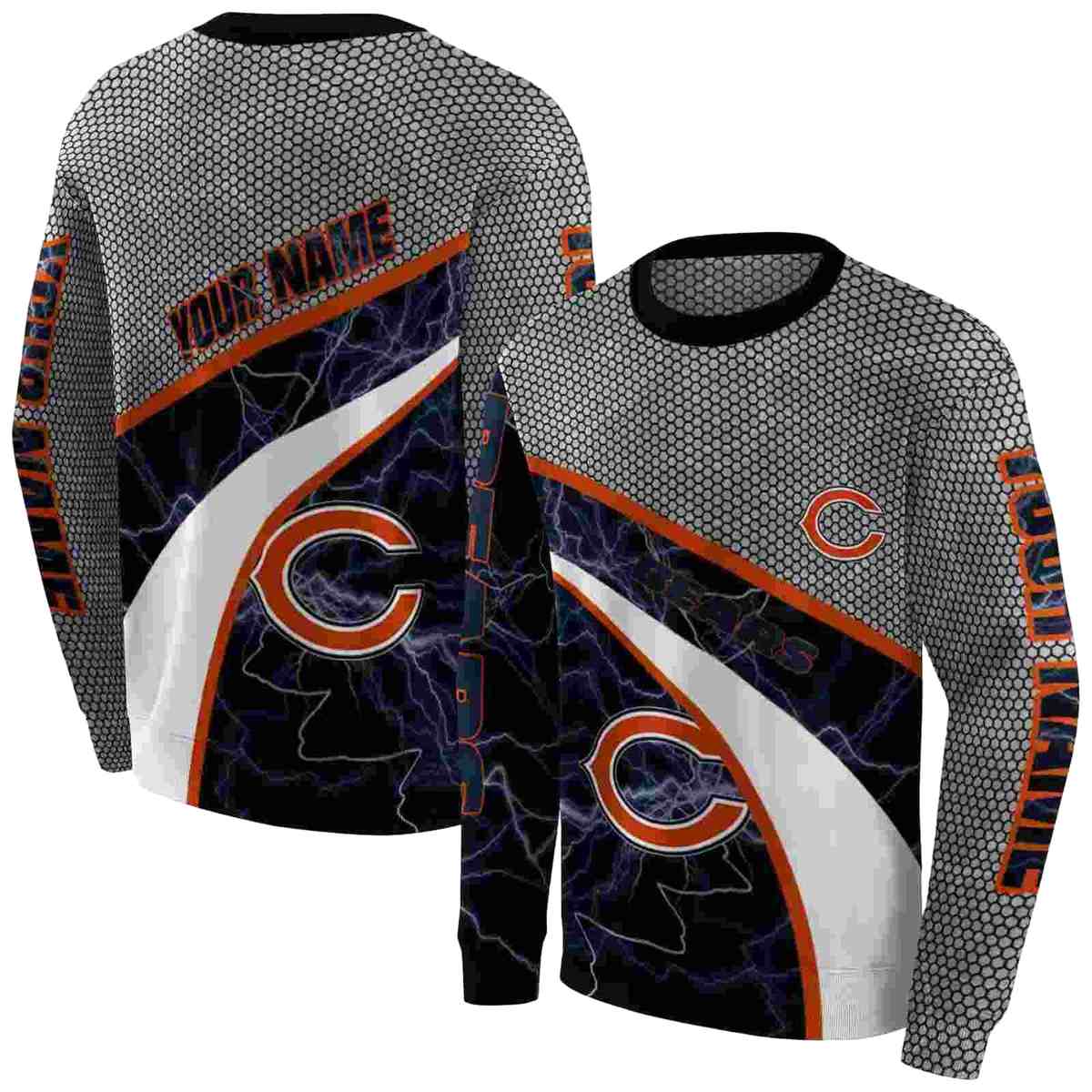 Elevate your streetwear game with our Personalized Chicago Bears Logo and Hexagonal Mesh Blue Black Gray All-Over Printed Sweatshirt. Perfect for fans and fashion enthusiasts alike, this sweatshirt is ideal for casual outings, lounging at home, or hitting the gym. Its unique design combines comfort and style, making it a standout piece in any wardrobe.