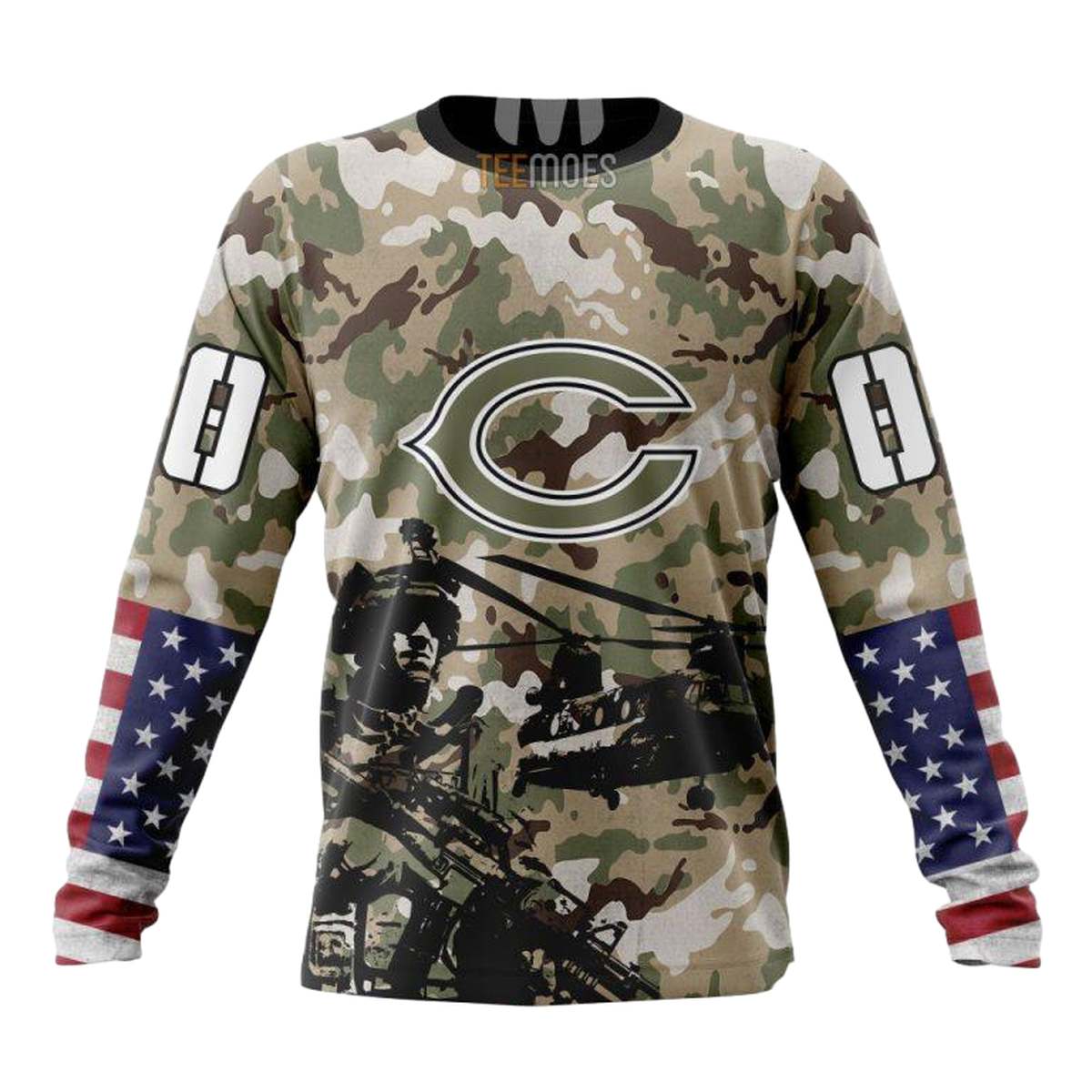 Show your pride and support with our Personalized Chicago Bears Veteran Salute To Service AOP Sweatshirt. Perfect for fans and veterans alike, this sweatshirt is ideal for casual outings, game days, or simply lounging at home. Its unique all-over print showcases your dedication, making it a standout piece in any streetwear collection.