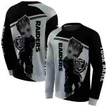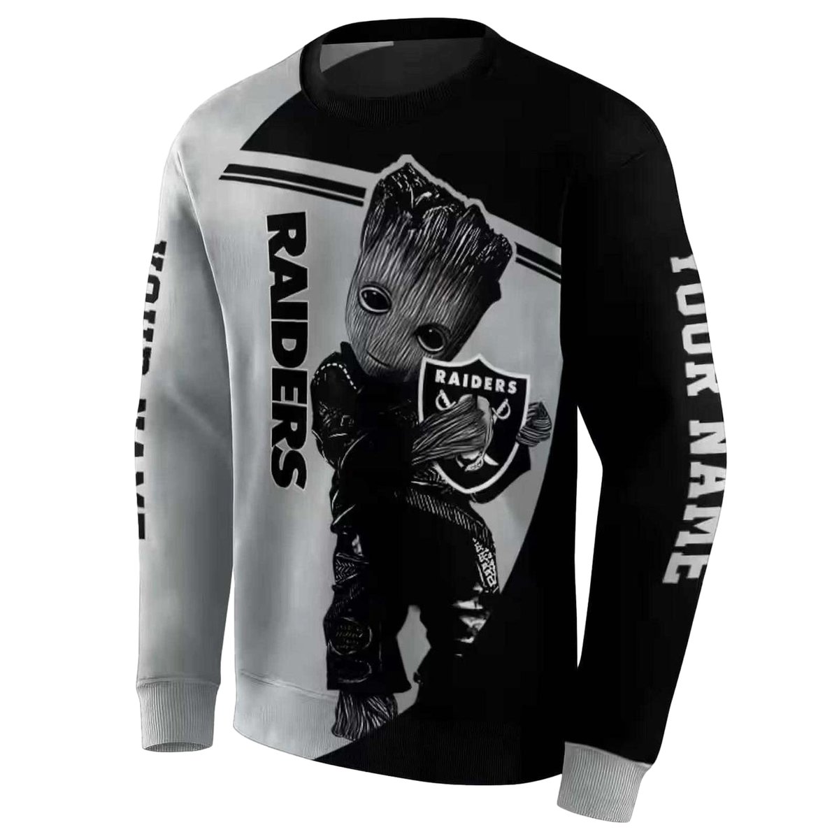 Introducing the Personalized Las Vegas Raiders Baby Groot Hug Logo Black AOP Sweatshirt, a must-have piece for any die-hard Raiders fan. This cozy and stylish sweatshirt is perfect for casual outings, game days, or lounging at home. With its vibrant all-over print featuring the beloved Baby Groot, it adds a fun twist to your streetwear collection while showcasing your team spirit.
