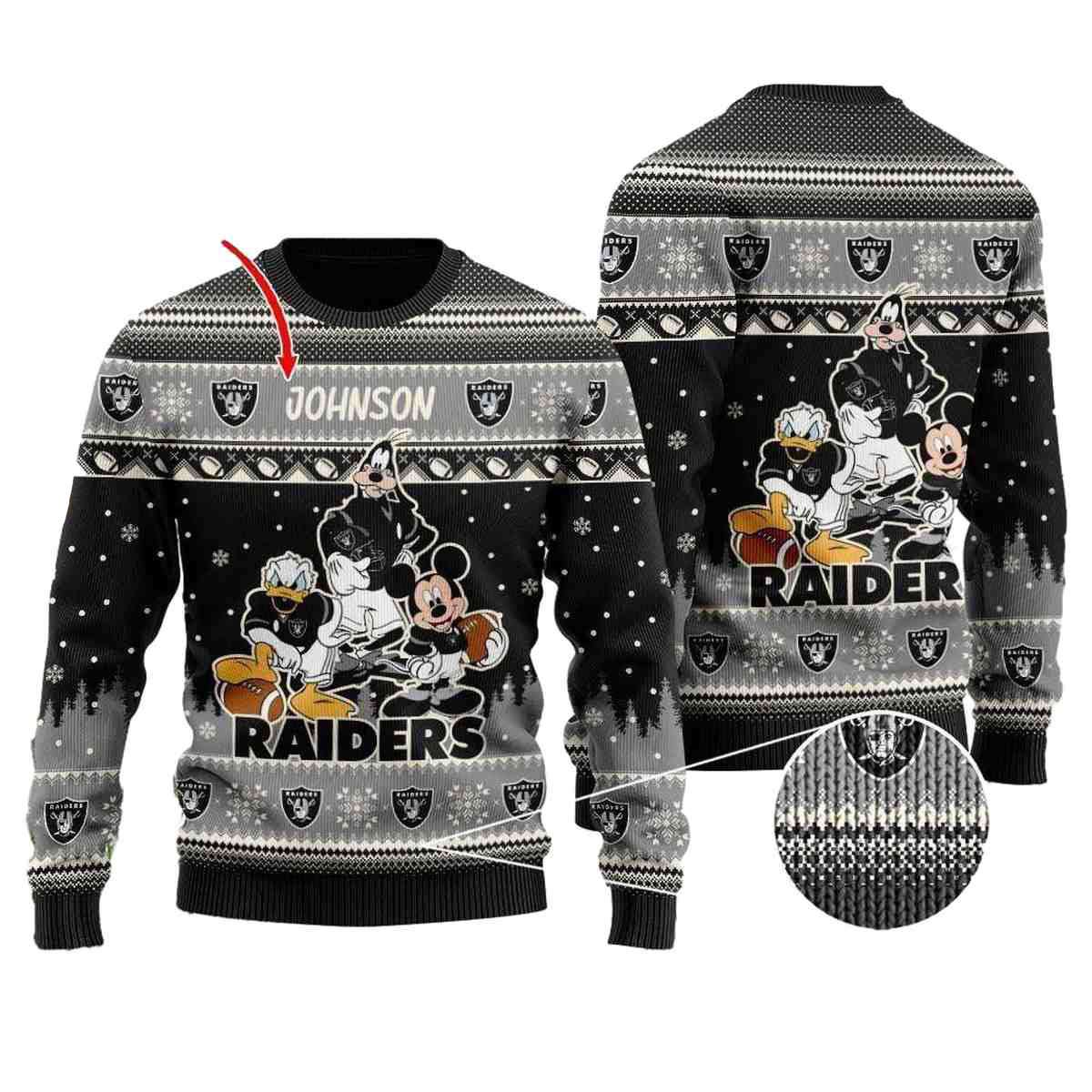 Get ready to show off your team spirit with a twist of Disney magic in our Personalized Las Vegas Raiders Ugly Sweater! Perfect for die-hard fans and Disney lovers alike, this sweater is a must-have for game days, holiday gatherings, or cozy nights in. With its whimsical design featuring Donald Duck, Mickey Mouse, and Goofy, it stands out as a unique blend of sports enthusiasm and festive cheer.