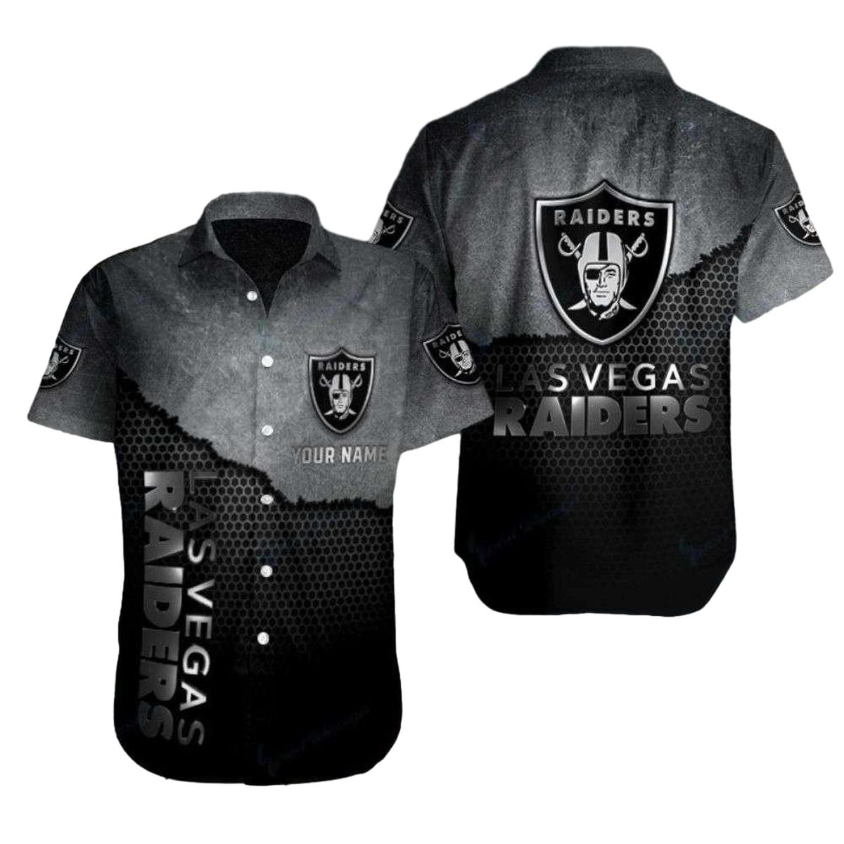 Embrace your inner fan with our Personalized Las Vegas Raiders Gradient Hexagon Black Pattern Hawaiian Shirt! This unique piece is designed for the spirited supporter who loves to showcase their team pride while enjoying the laid-back vibes of summer. Perfect for game days, beach outings, or casual gatherings, this shirt effortlessly combines style and fandom in a fun graphic print.