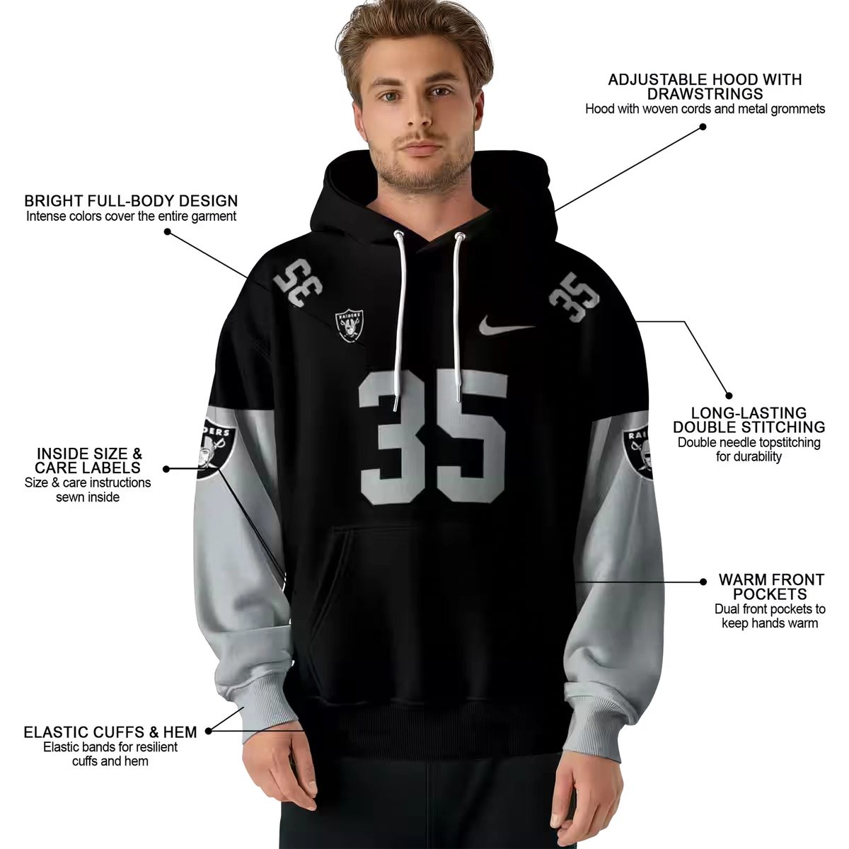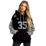 Introducing the Personalized Las Vegas Raiders Logo Minimal Design Black AOP Hoodie, an essential piece for fans who want to showcase their team spirit in style. Perfect for casual outings, game days, or simply lounging at home, this hoodie combines a sleek design with comfort, making it a must-have for any Raiders enthusiast.