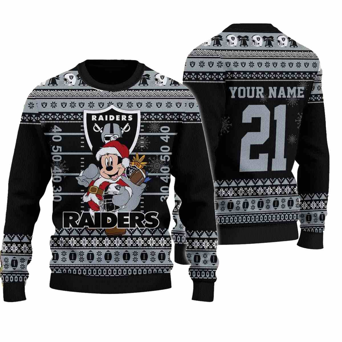 Get ready to celebrate the holiday season with a twist of fun in our Personalized Las Vegas Raiders Mickey Mouse Santa Ugly Christmas Sweater! Perfect for fans of both the Raiders and the beloved Disney character, this whimsical sweater is ideal for holiday parties, family gatherings, or simply lounging at home while you cheer on your favorite team. Its unique design makes it a standout piece that will surely spark conversations and spread joy wherever you go!